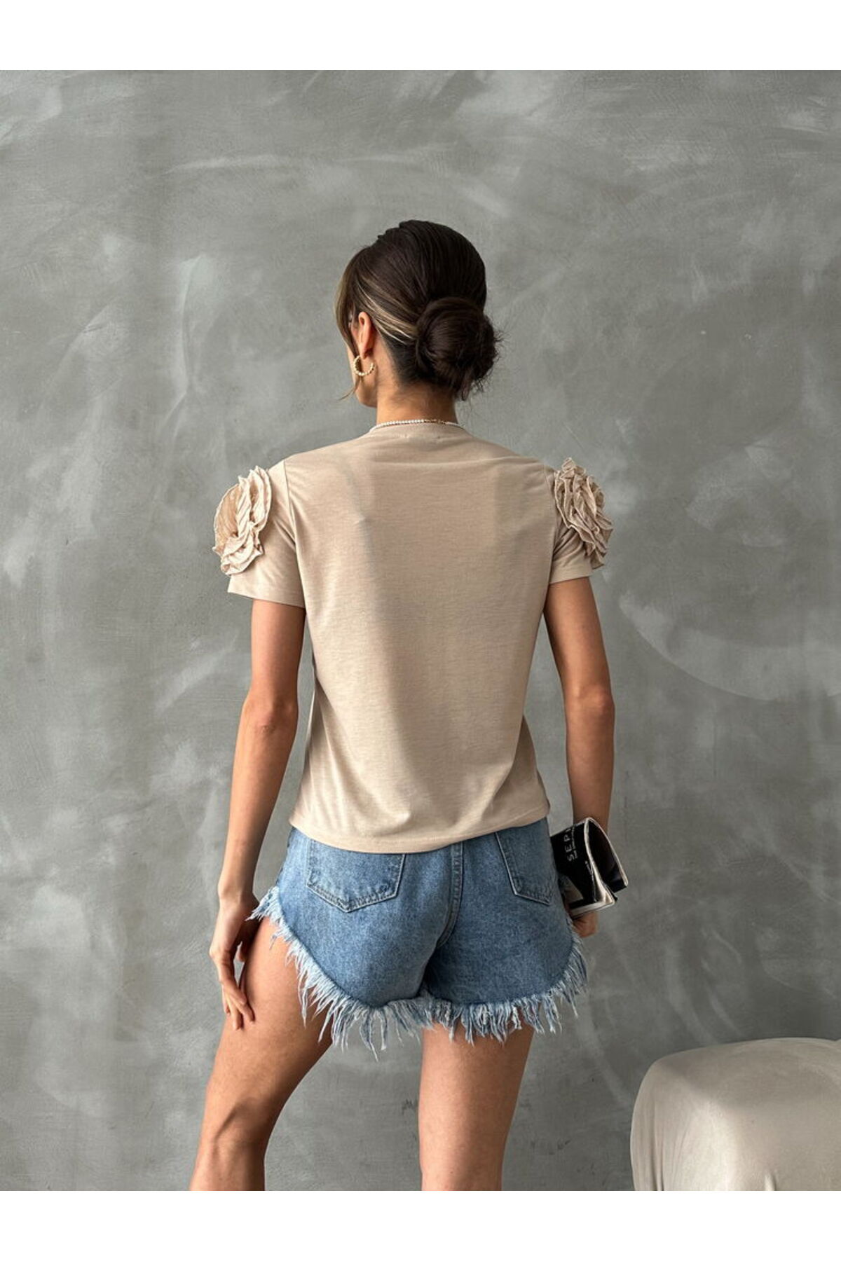 Kadın Omuzları Gül Detaylı Şık T-Shirt Bisiklet Yaka Kısa Kollu Tişört D2640038001-Taş