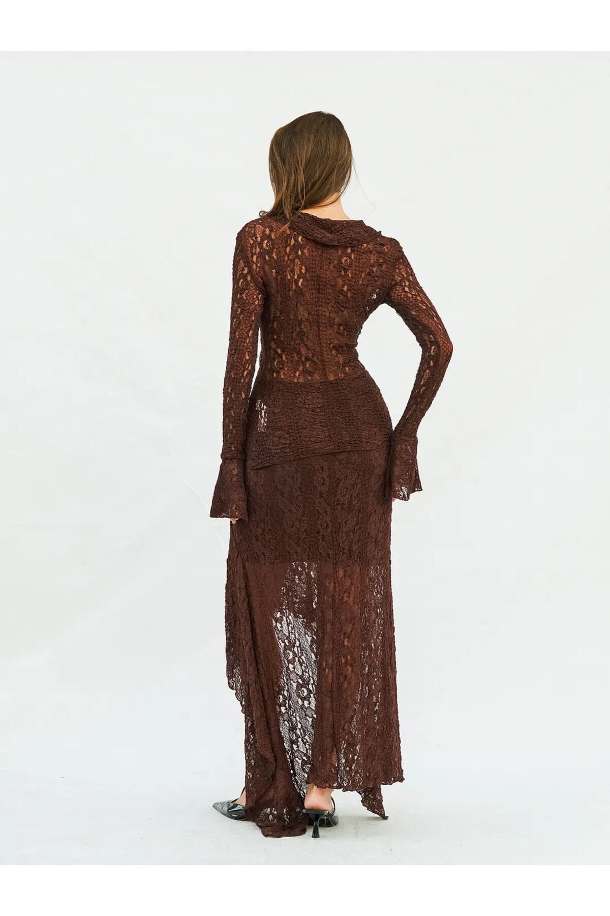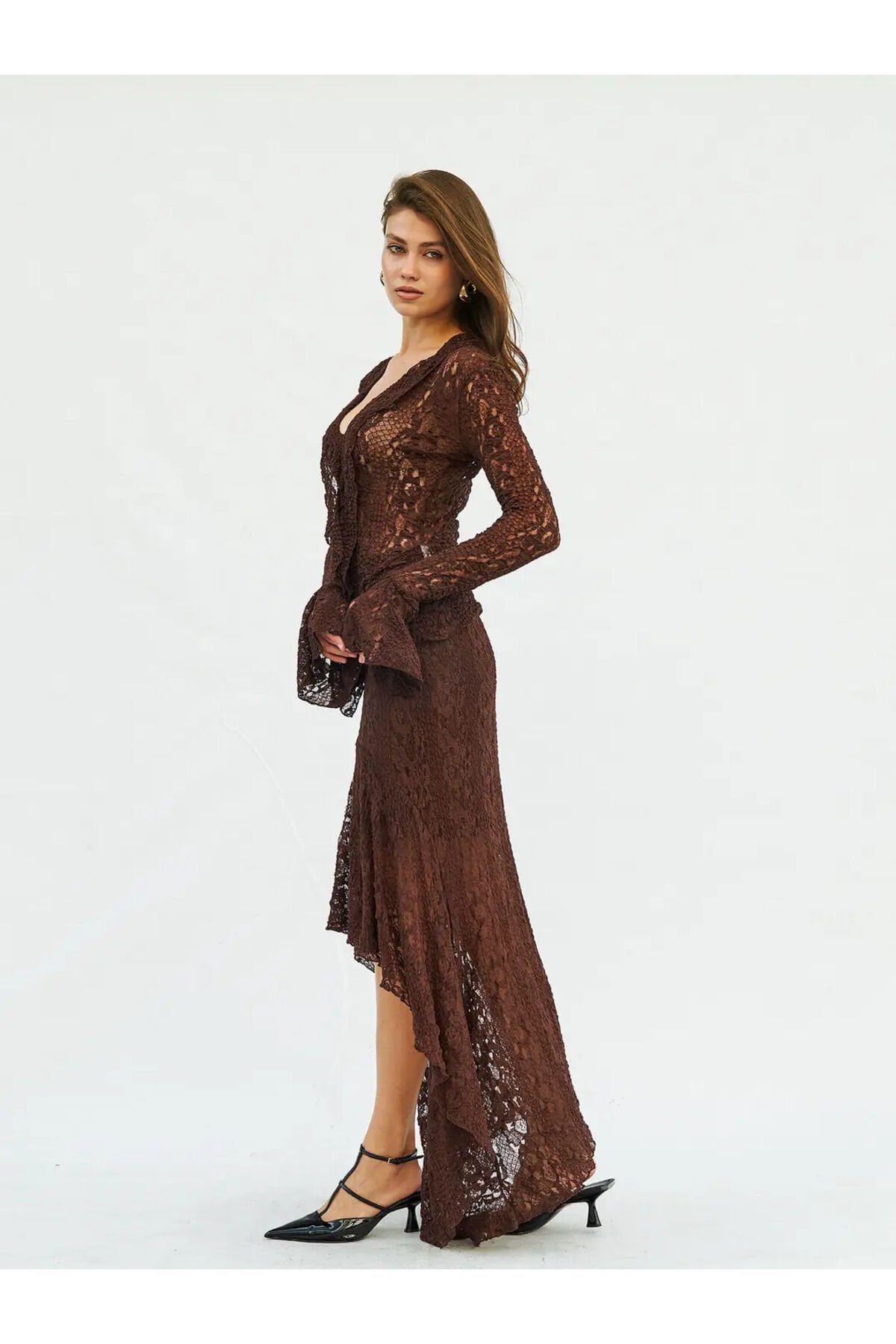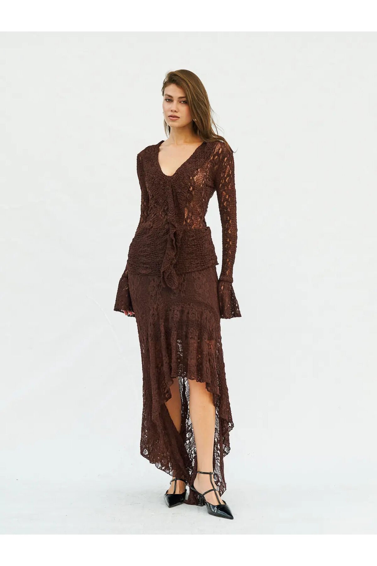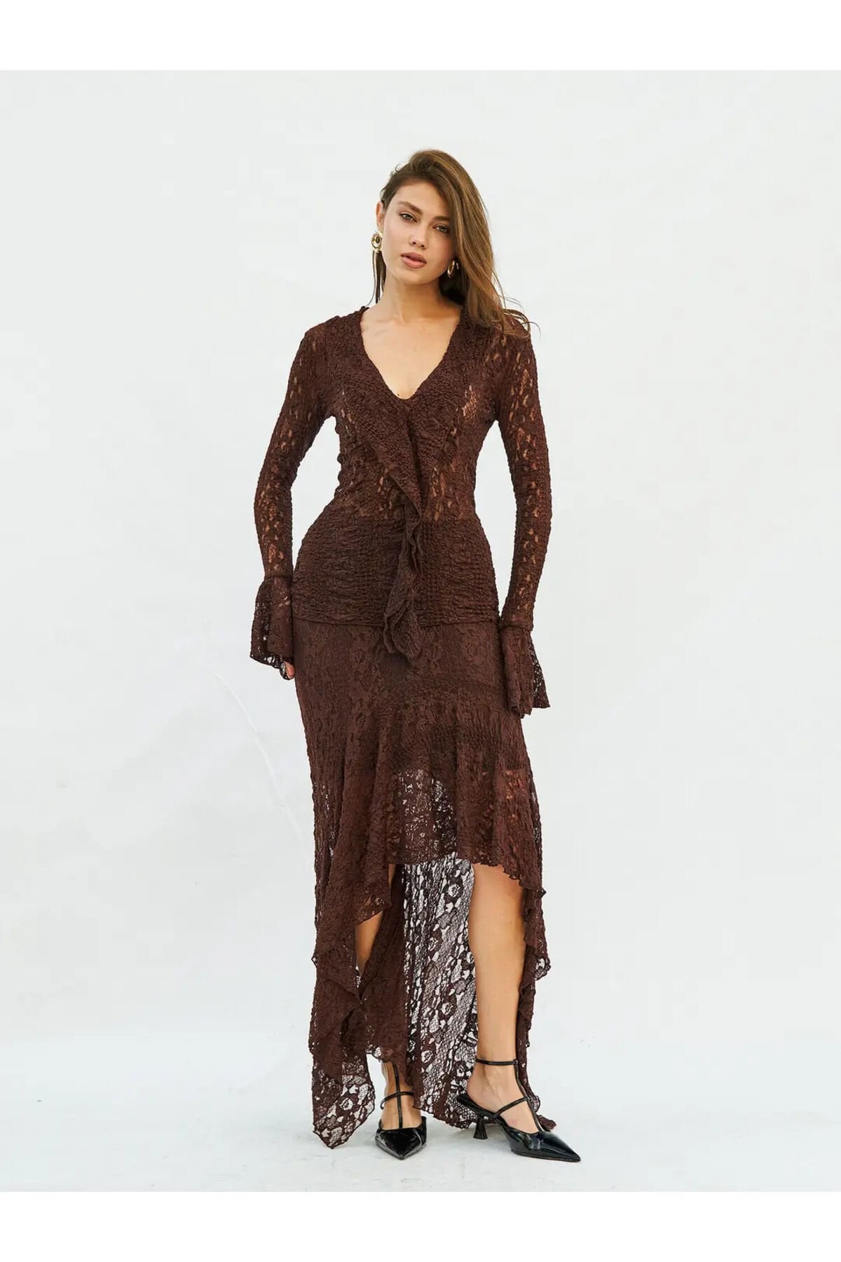 V Yaka Volan Detaylı Dantel Bluz - Uzun Kollu Şık Transparan Bluz Zarafeti ve modern detayları bir araya getiren bu dantel bluz, gardırobunuzun en iddialı parçalarından biri olmaya aday.; İnce işçilikli dantel dokusu ve feminen hatları ön plana çıkaran tasarımıyla hem gündüz hem de gece şıklığınızı tamamlar.; Ürün Özellikleri: Tasarım: Derin V yaka kesimi ve ön kısımda boydan boya uzanan romantik volan detayları ile hareketli bir görünüm sunar.; Doku: Yüksek kaliteli, esnek ve yumuşak dantel kumaştan üretilmiştir.; Transparan yapısı sayesinde zarif bir dekolte görünümü sağlar.; Kol Detayı: İspanyol kol formunu anımsatan, bilek kısımları volanlı uzun kol tasarımıyla retro ve şık bir hava katar.; Kalıp: Vücut hatlarını nazikçe saran slim-fit kesimiyle modern bir silüet oluşturur.; Kombin Önerisi: İçerisine tercih edeceğiniz şık bir büstiyer veya bralet ile gece davetlerinde, yüksek bel kumaş pantolon veya eteklerle ofis şıklığında kullanabilirsiniz.; Kullanım Alanları: Özel davetler, akşam yemekleri, partiler veya stilinizi konuşturmak istediğiniz her an için uygundur.; Farklı renk seçenekleriyle her tarza hitap eden bu bluz, zamansız tasarımıyla uzun yıllar favoriniz olacak.; Yıkama ve Bakım: Dantel dokusunun formunu koruması için düşük ısıda hassas yıkama yapılması veya elde yıkanması önerilir.; Stilinizi dantelin büyüleyici dokusu ve volanların enerjisiyle yenileyin!