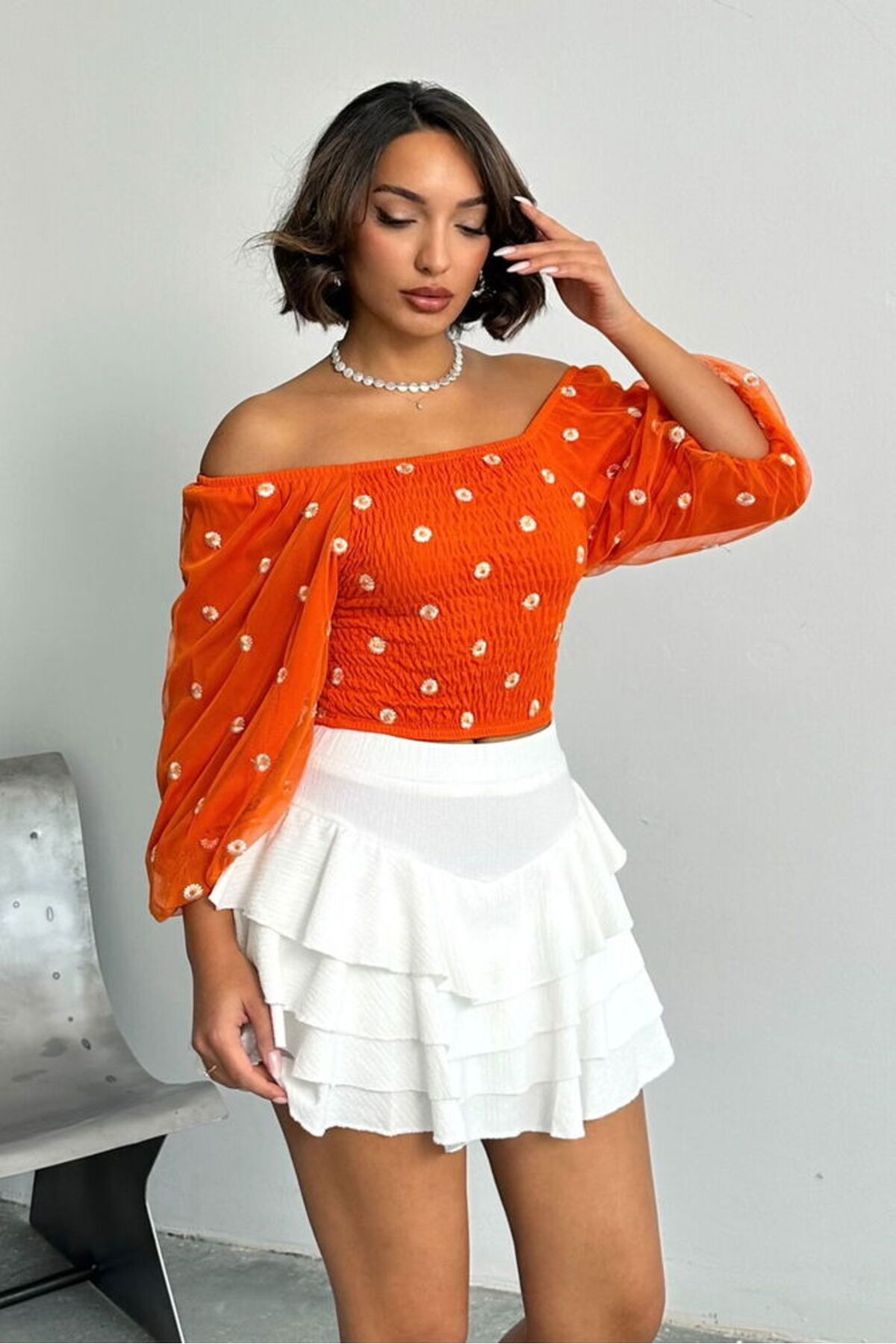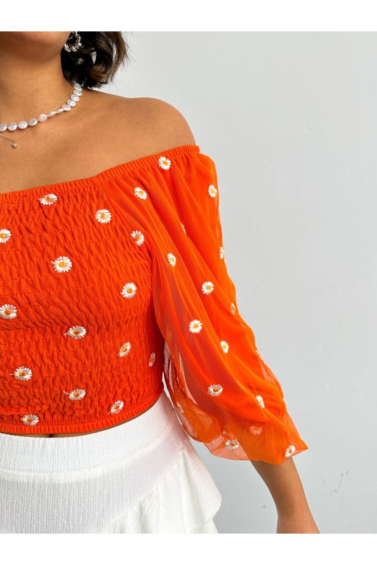 Kadın Gipeli Papatya Desenli Madonnyaka Tül Bluz