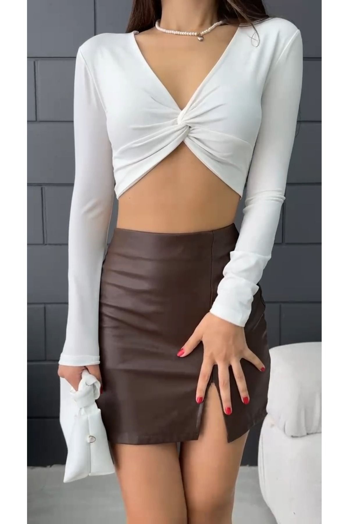 Ön Bağlamalı Sandy Bluz V Yaka Önü Drape Detaylı Uzun Kollu Süper Crop Kadın Beyaz Bluz