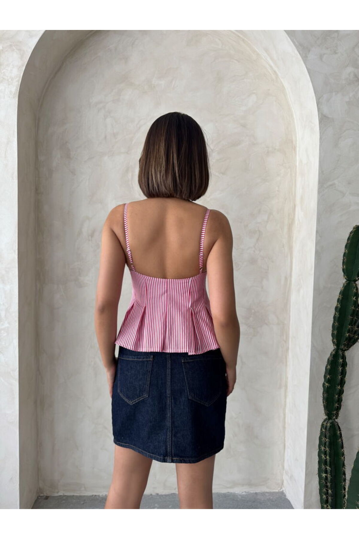Çizgili İnce Askılı Düğme Detaylı Peplum Bluz