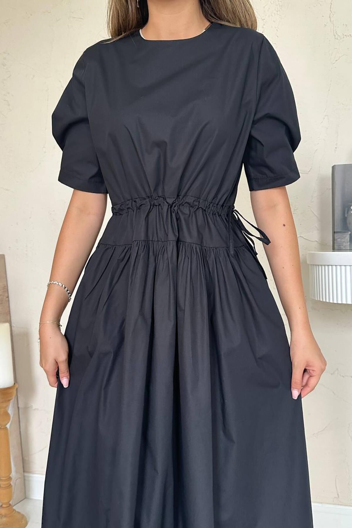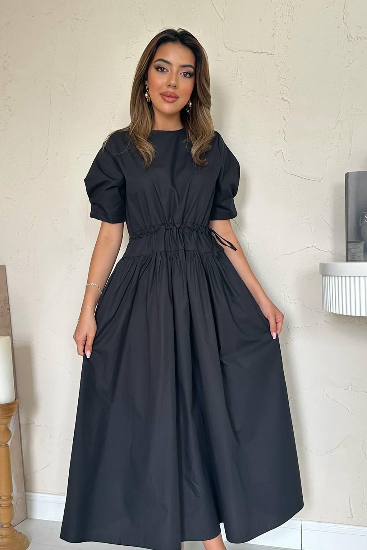 Kadın Belden Büzgülü Tünel Detaylı Poplin Maxi Elbise 9046001i2i534-Siyah