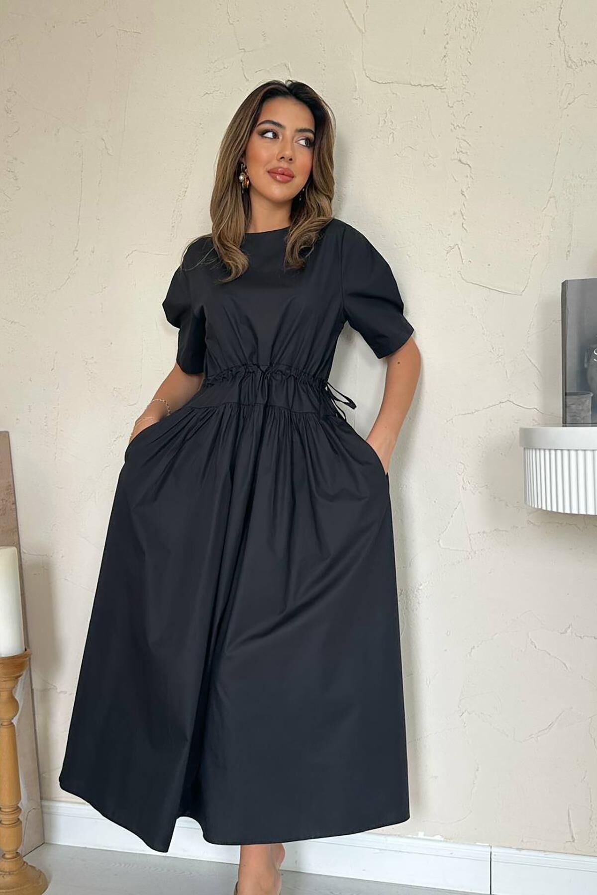 **Kadın Belden Büzgülü Tünel Detaylı Poplin Maxi Elbise** Zarafeti ve konforu bir arada sunan **Belden Büzgülü Tünel Detaylı Poplin Maxi Elbise**, gardırobunuzun en joker parçalarından biri olmaya aday.; Modern kesimi ve nefes alan kumaş yapısıyla hem günlük stilde hem de şık davetlerde zahmetsiz bir şıklık sunar.; **Ürün Özellikleri:** * **Kumaş Türü:** Yüksek kaliteli poplin kumaştan üretilmiştir.; Hafif, terletmeyen ve nefes alan yapısı sayesinde dört mevsim kullanım konforu sağlar.; * **Tasarım Detayları:** Bel kısmında yer alan ayarlanabilir tünel büzgü detayı, bel hattınızı vurgulamanıza olanak tanırken aynı zamanda vücut tipinize göre kişiselleştirilebilir bir kullanım sunar.; * **Kol ve Boy:** Modern bir hava katan hafif kabarık kısa kol detayına ve ayak bileğine kadar uzanan maxi boy kesime sahiptir.; * **Kesim:** Rahat ve dökümlü alt formu sayesinde hareket özgürlüğü sağlar, gün boyu konforlu hissettirir.; * **Çok Yönlü Kullanım:** Altına giyeceğiniz bir sandalet veya spor ayakkabı ile spor-şık; topuklu bir ayakkabı ve gold aksesuarlar ile gece şıklığına kolayca uyarlanabilir.; **Ürün Detayları ve Bakım:** * Maxi boy, yuvarlak yaka.; * Belden ayarlanabilir bağlama detayı.; * Yan kısımlarda fonksiyonel cep detayları mevcuttur.; * Yıkama Talimatı: 30 derecede hassas yıkama önerilir.; * Farklı renk seçenekleri ile her tarza hitap eder.; Siz de çabasız şıklığı ve poplin kumaşın ferahlığını hissetmek istiyorsanız, bu tünel detaylı elbiseyi hemen sepetinize ekleyebilirsiniz!
