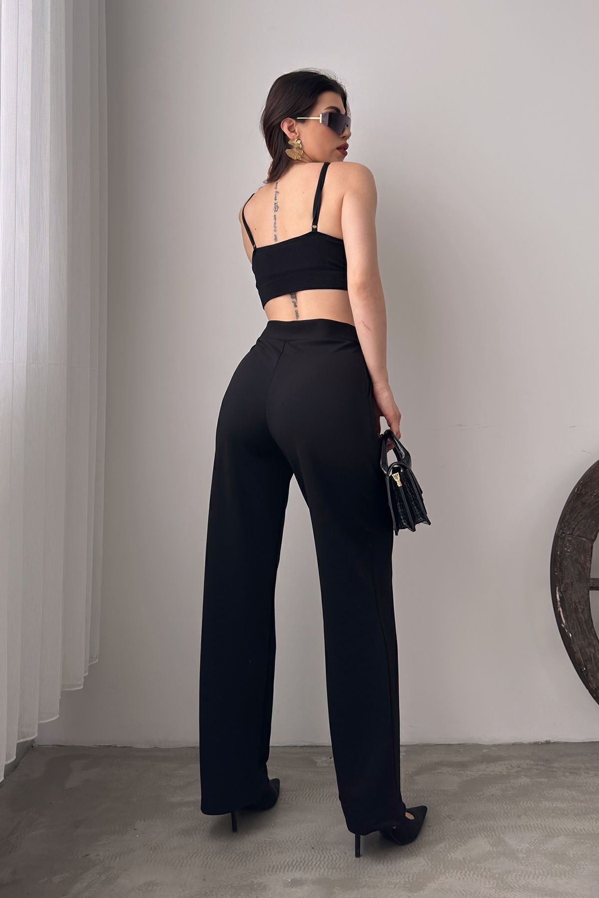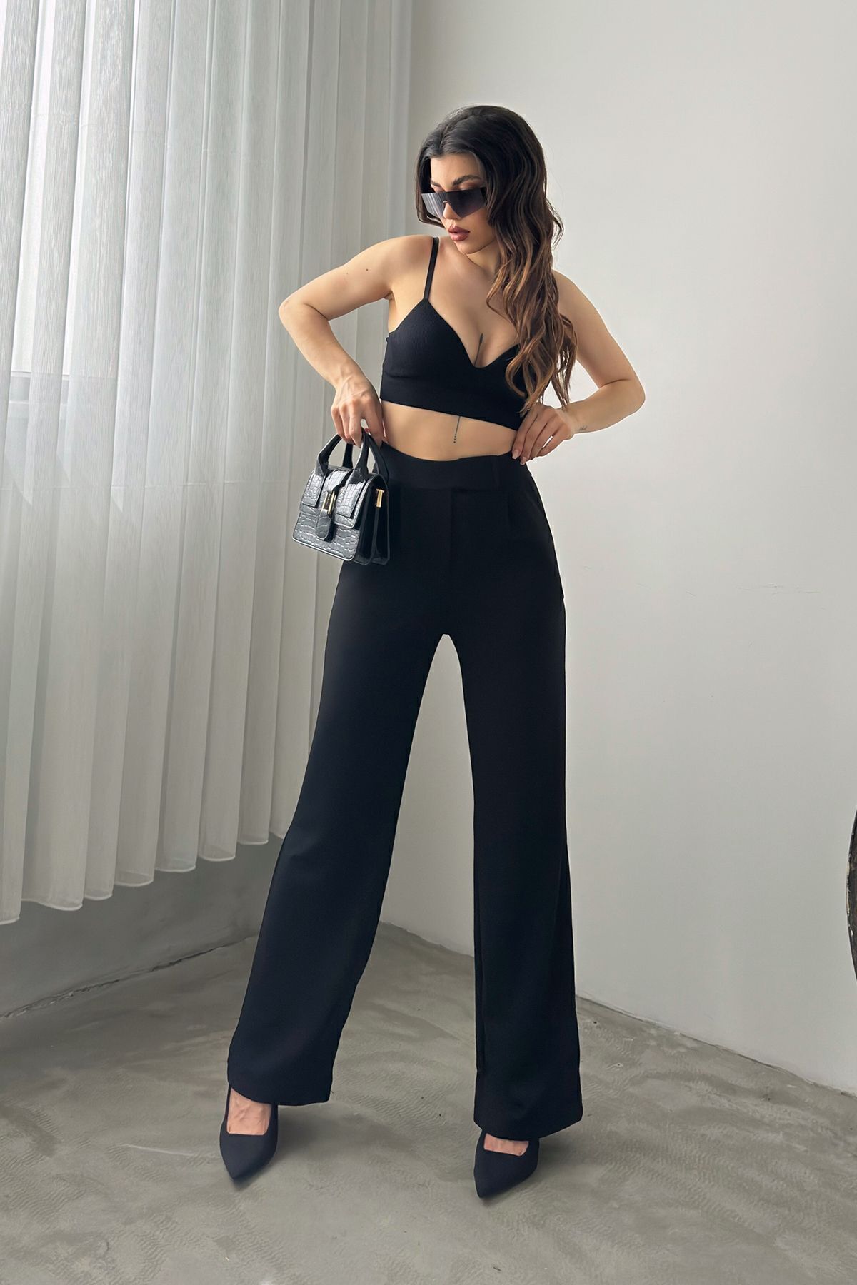 Kadın Siyah Yüksek Bel Pileli Palazzo Pantolon