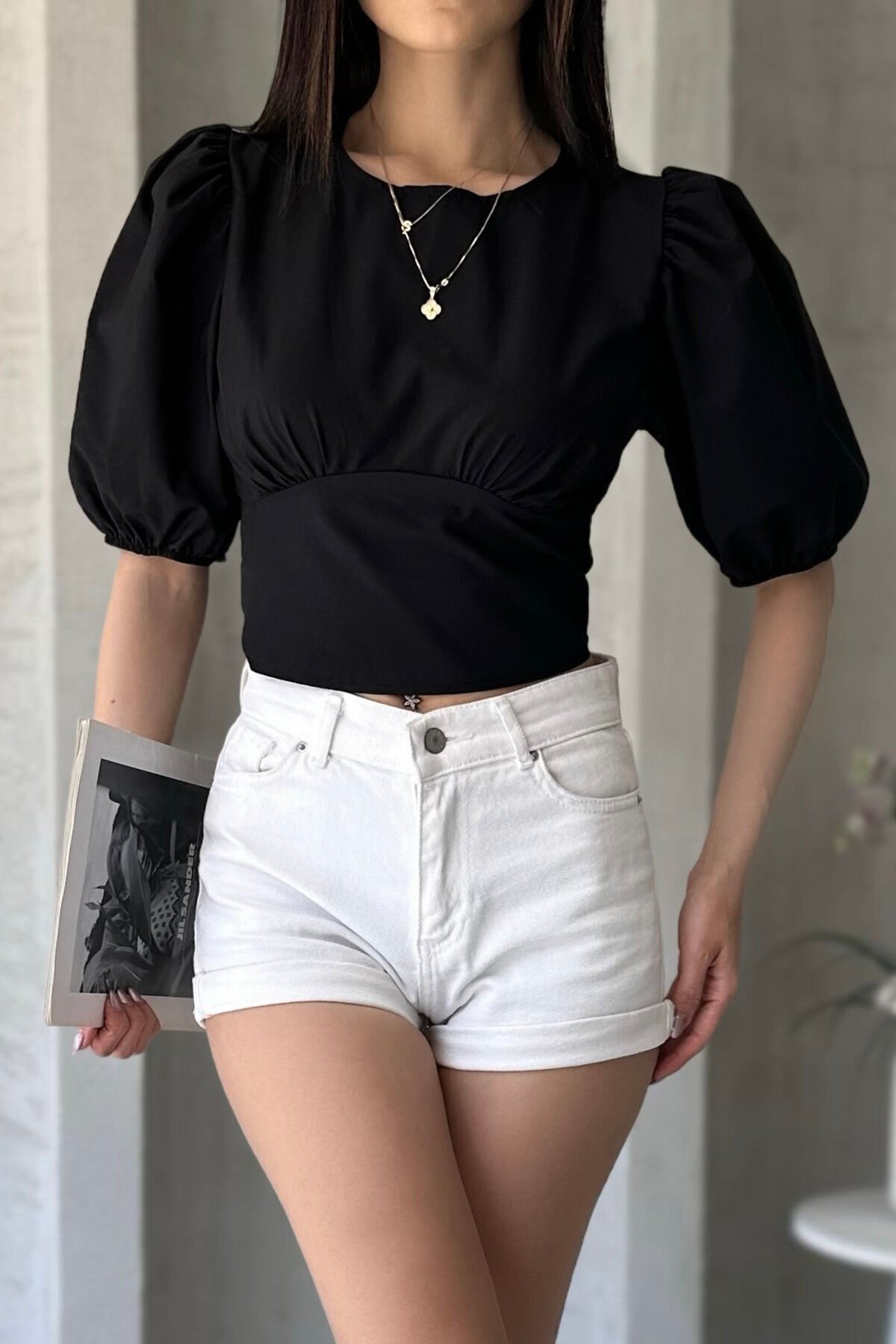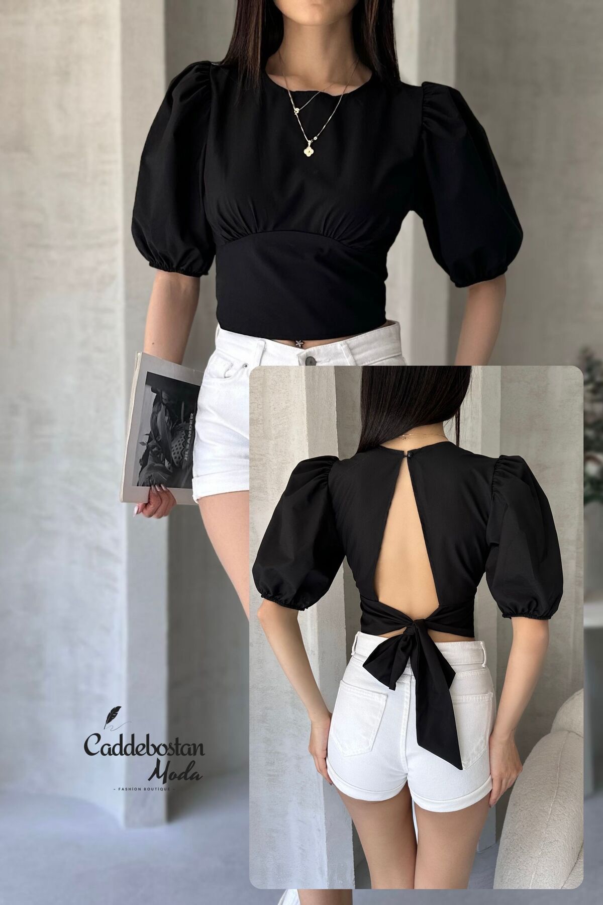 Karpuz Balon Kol Sırt Dekolteli Likralı Kadın Poplin Bluz
