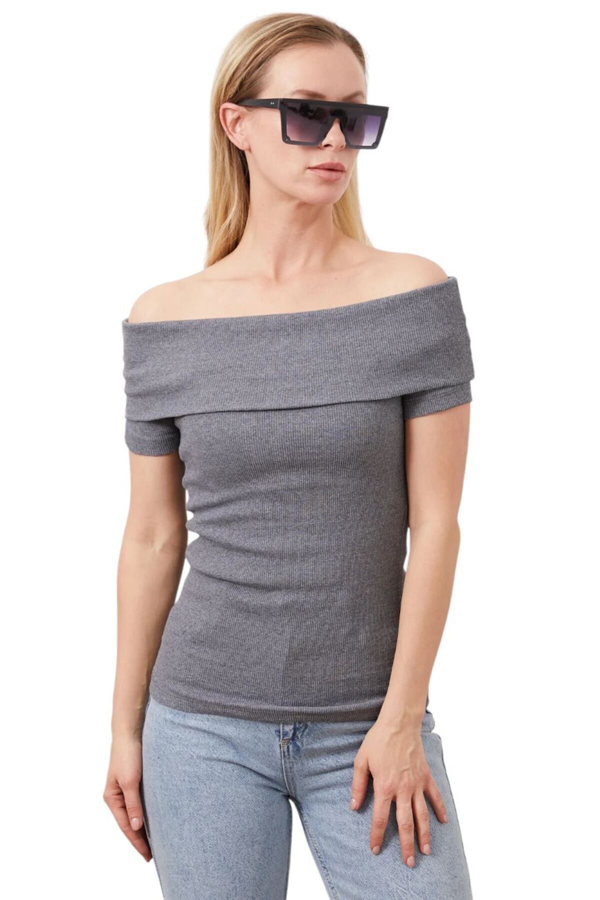 Modonna Yaka Kısa Kol Bluz 103055033125-Gri Modonna Yaka Kısa Kol Bluz