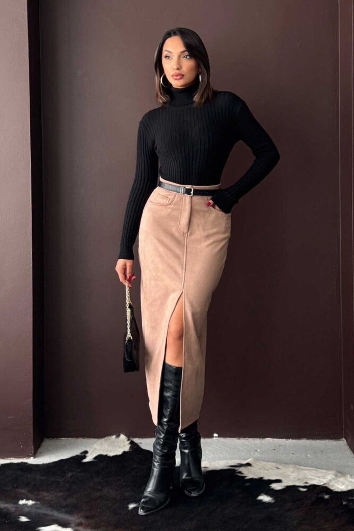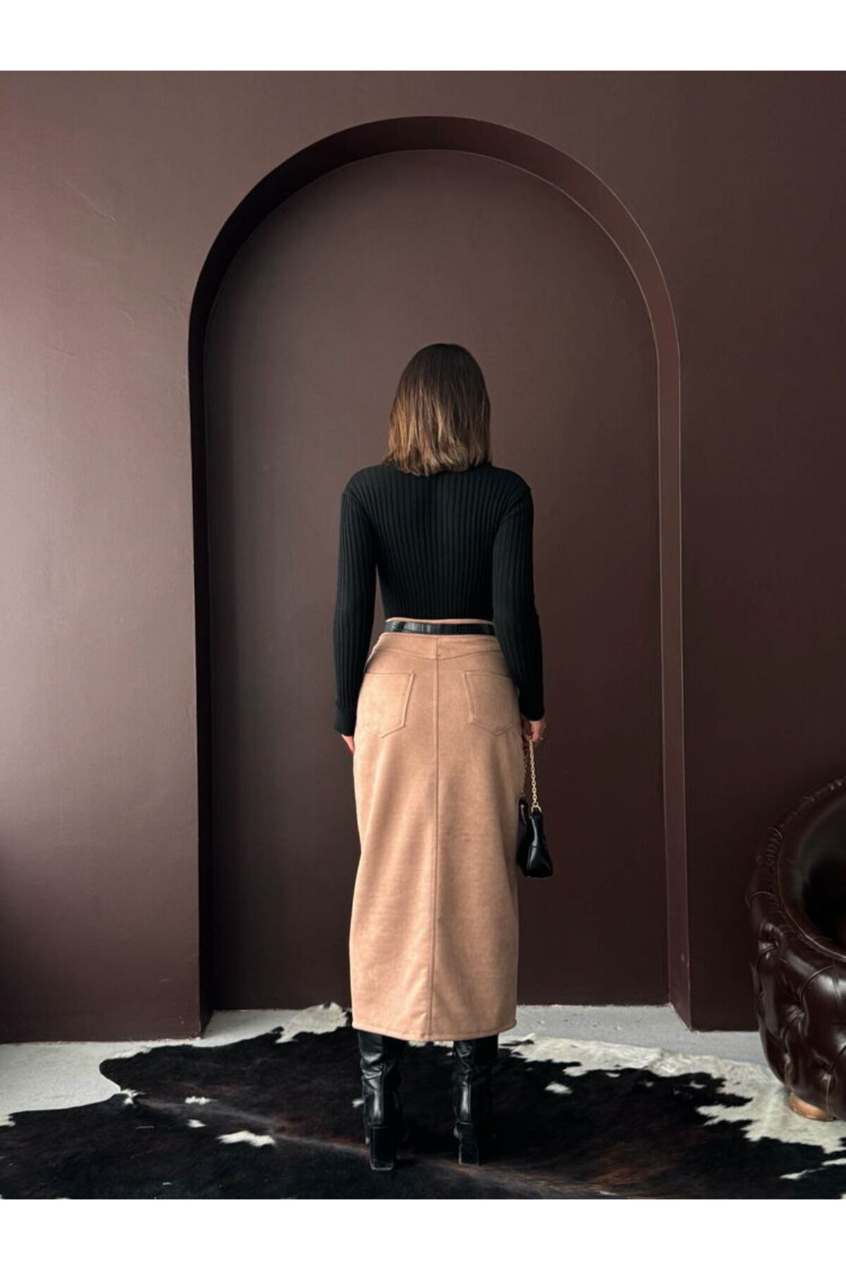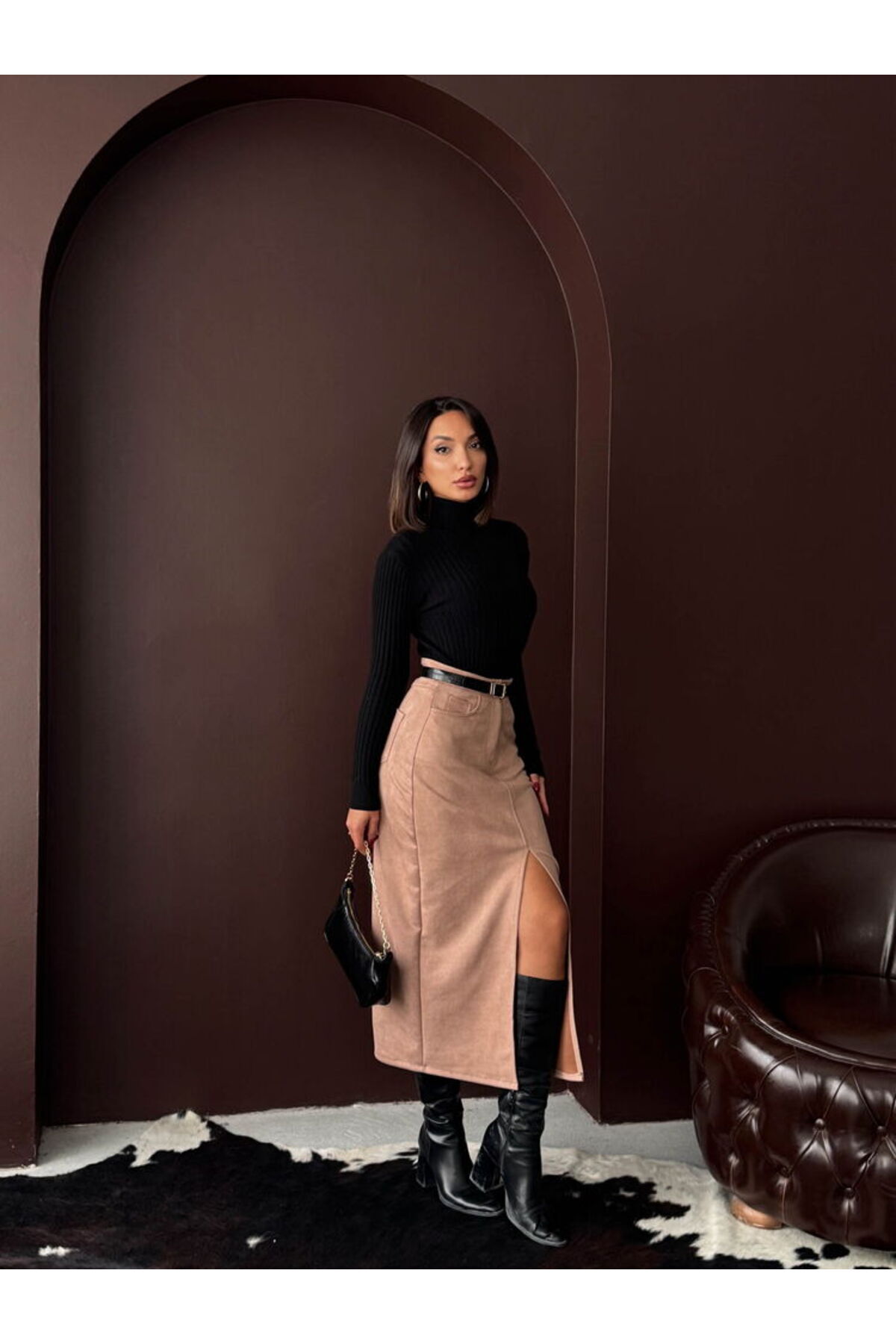 Yırtmaç Detaylı Süet Midi Boy Etek | Şık ve Modern Kesim Etek