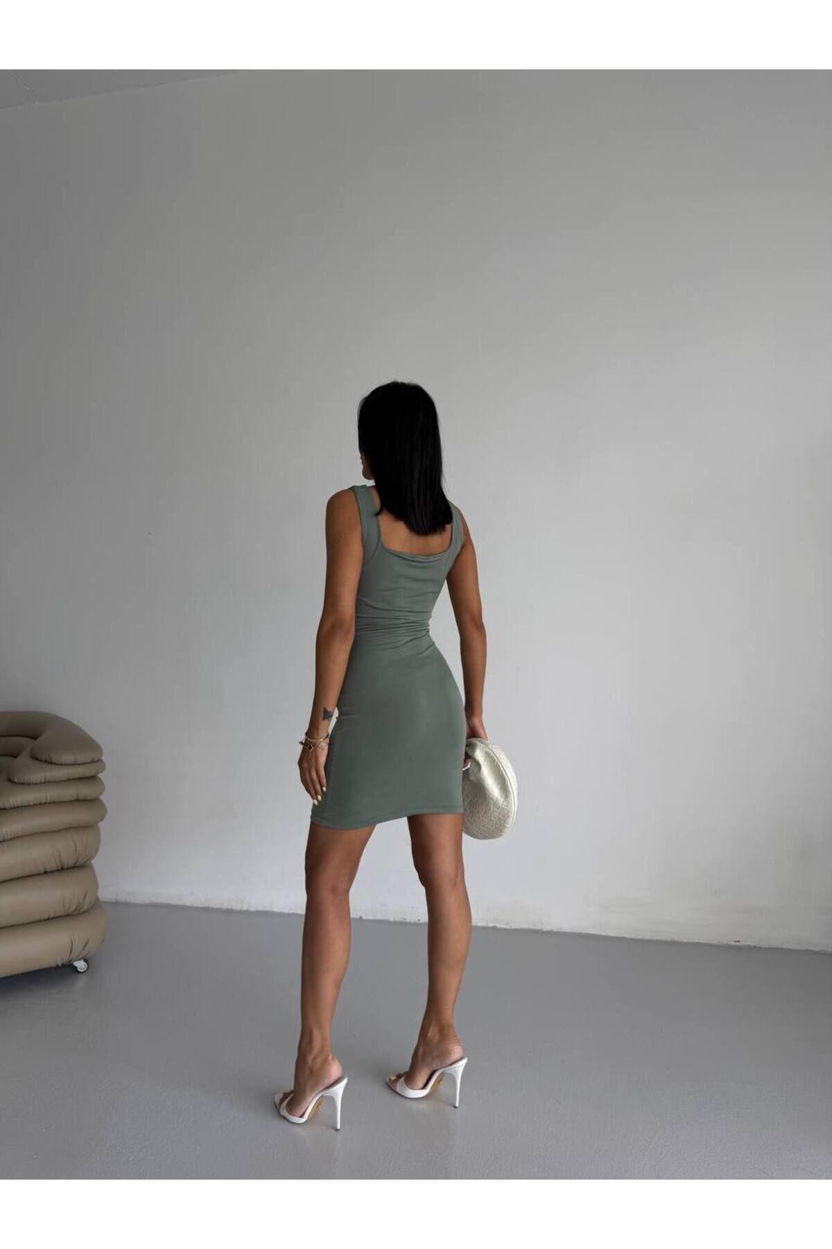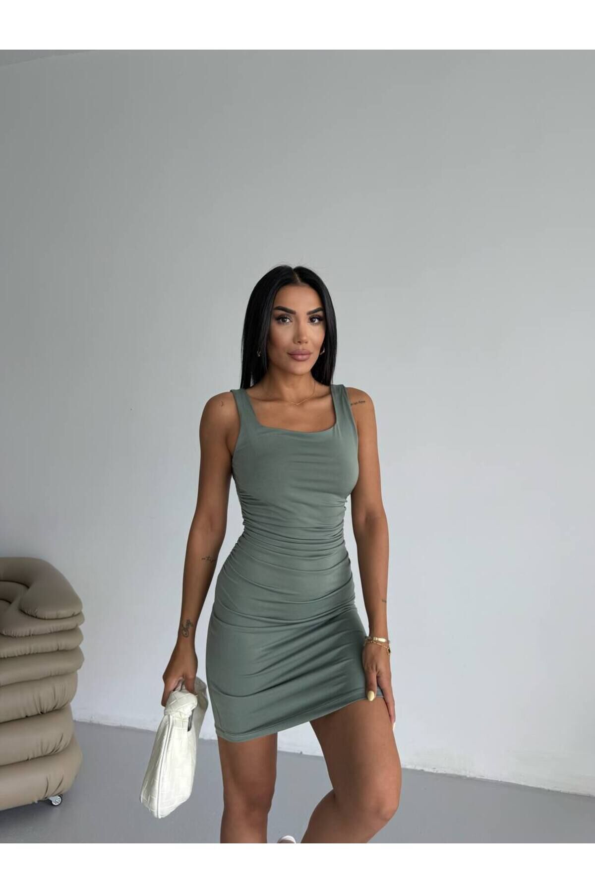 Büzgülü Mini Kolsuz Kalın Askılı Kare Yaka Elbise S40A2308OKMH0-Yeşil Büzgülü Mini Kolsuz Kalın Askılı Kare Yaka Elbise