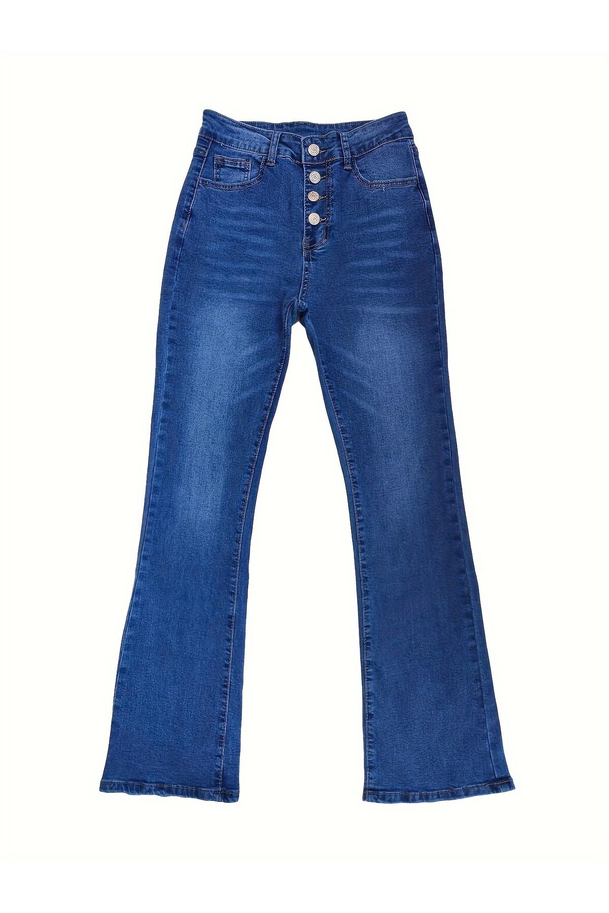 Yüksek Bel önden Düğmeli Cep Detay İspanyol Paça Denim Kadın Mavi Kot Jean Pantolon