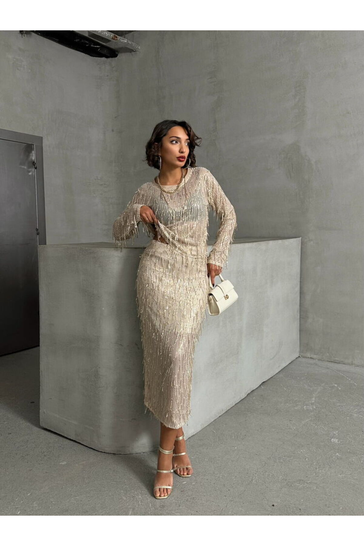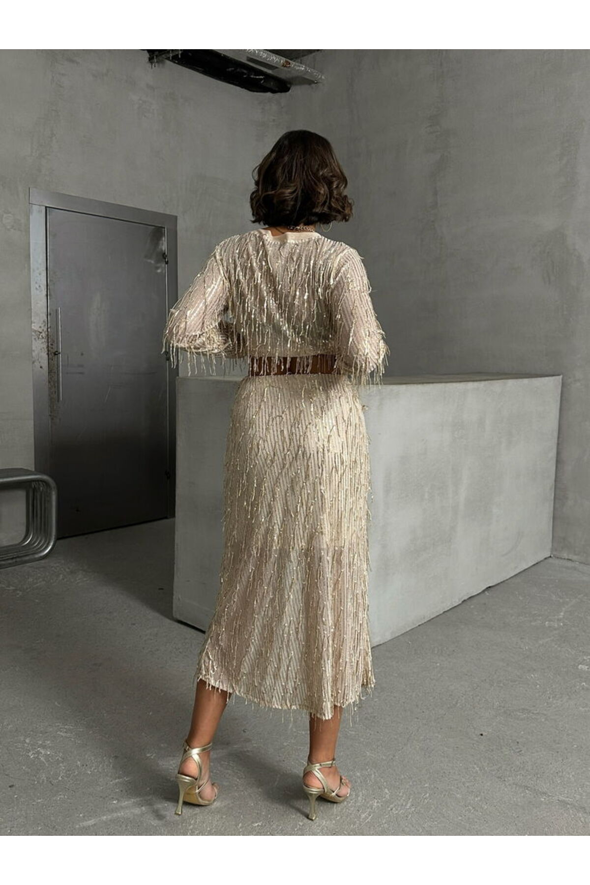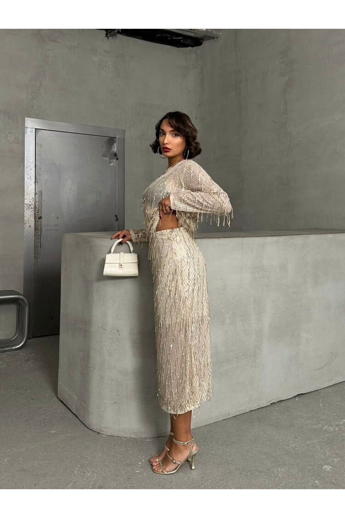 Yüksek Bel Pullu Payetli Saçaklı Tuy Detaylı Midi Boy Şık Etek