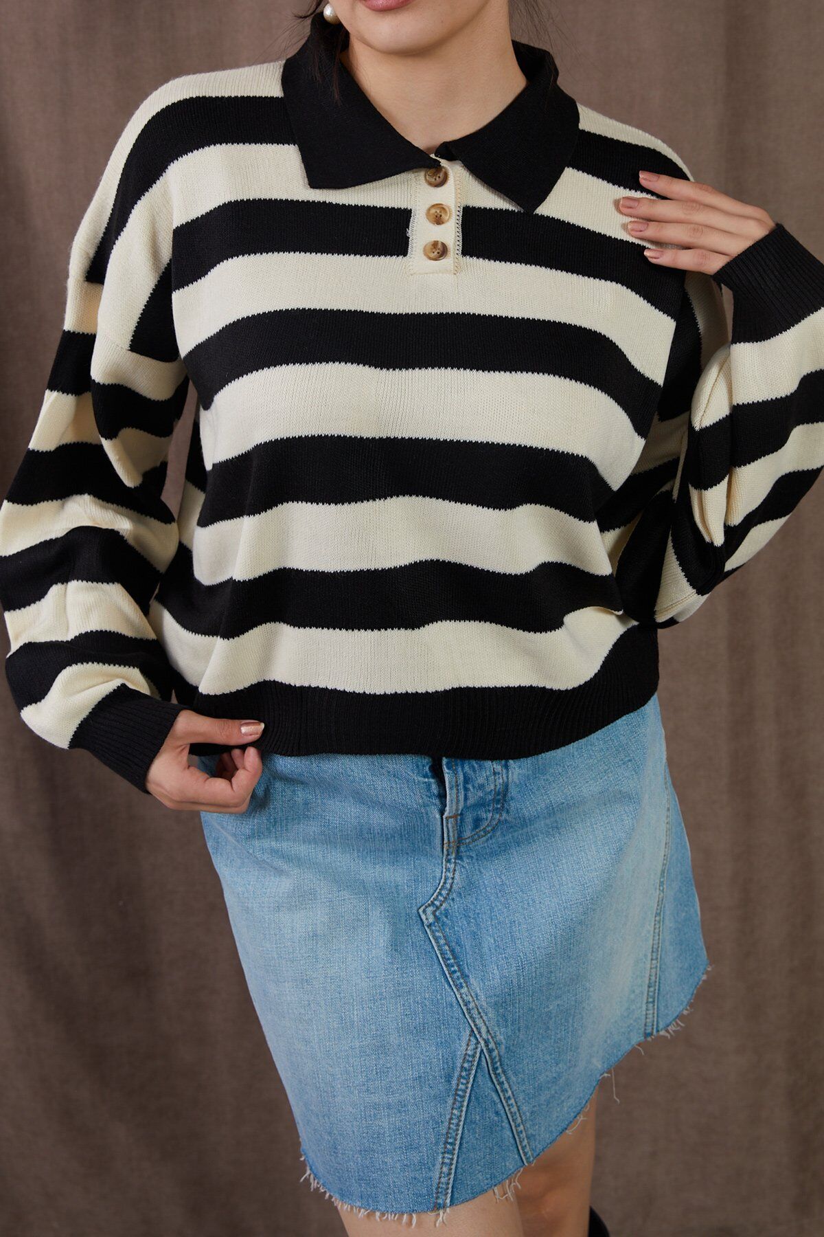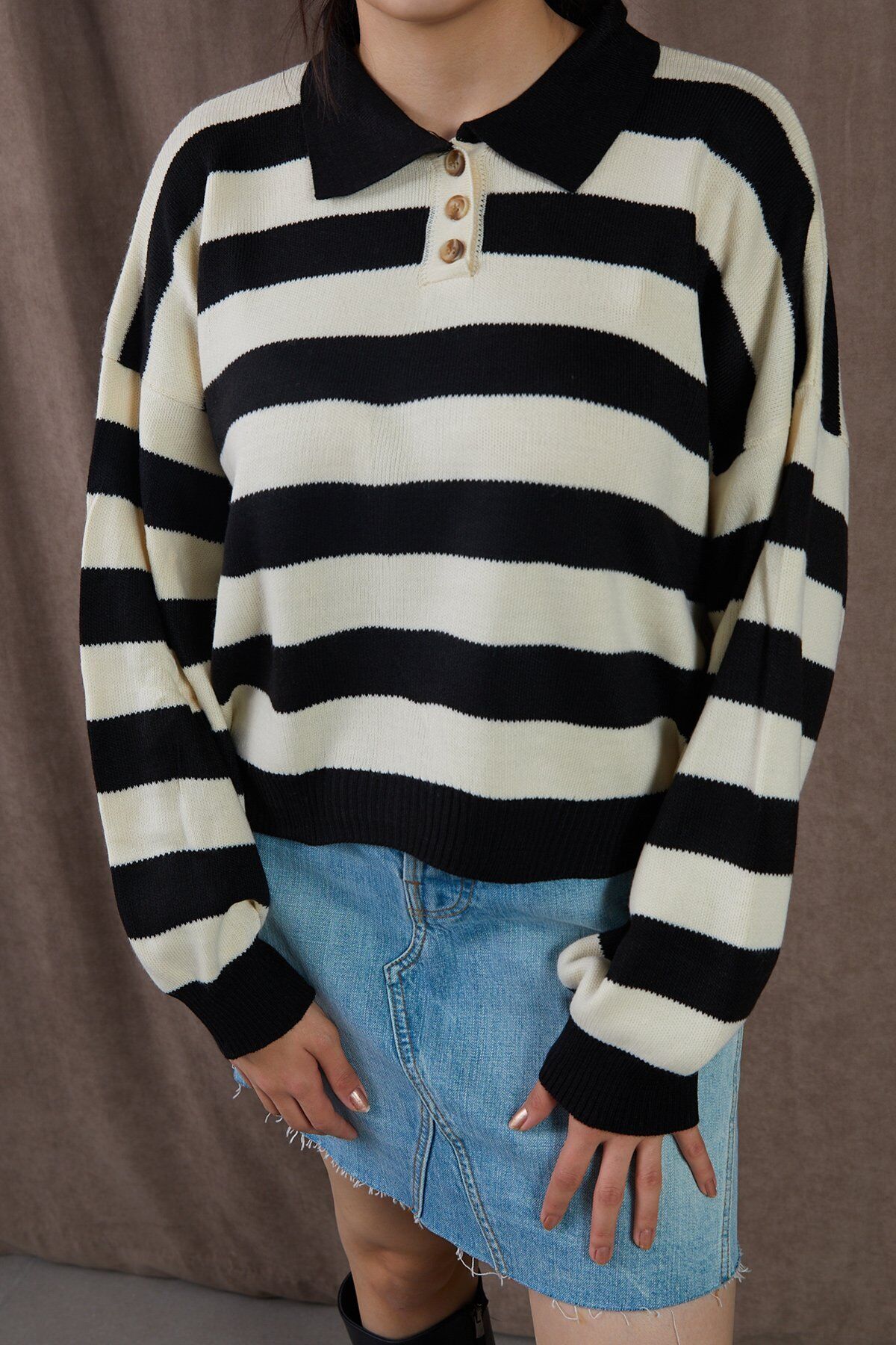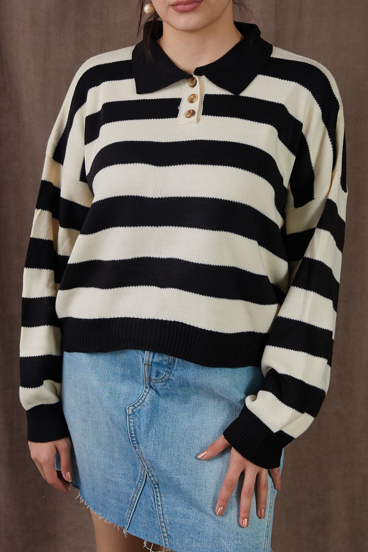 Çizgili Polo Yaka Triko Düğme Detaylı Bej-Siyah Kazak