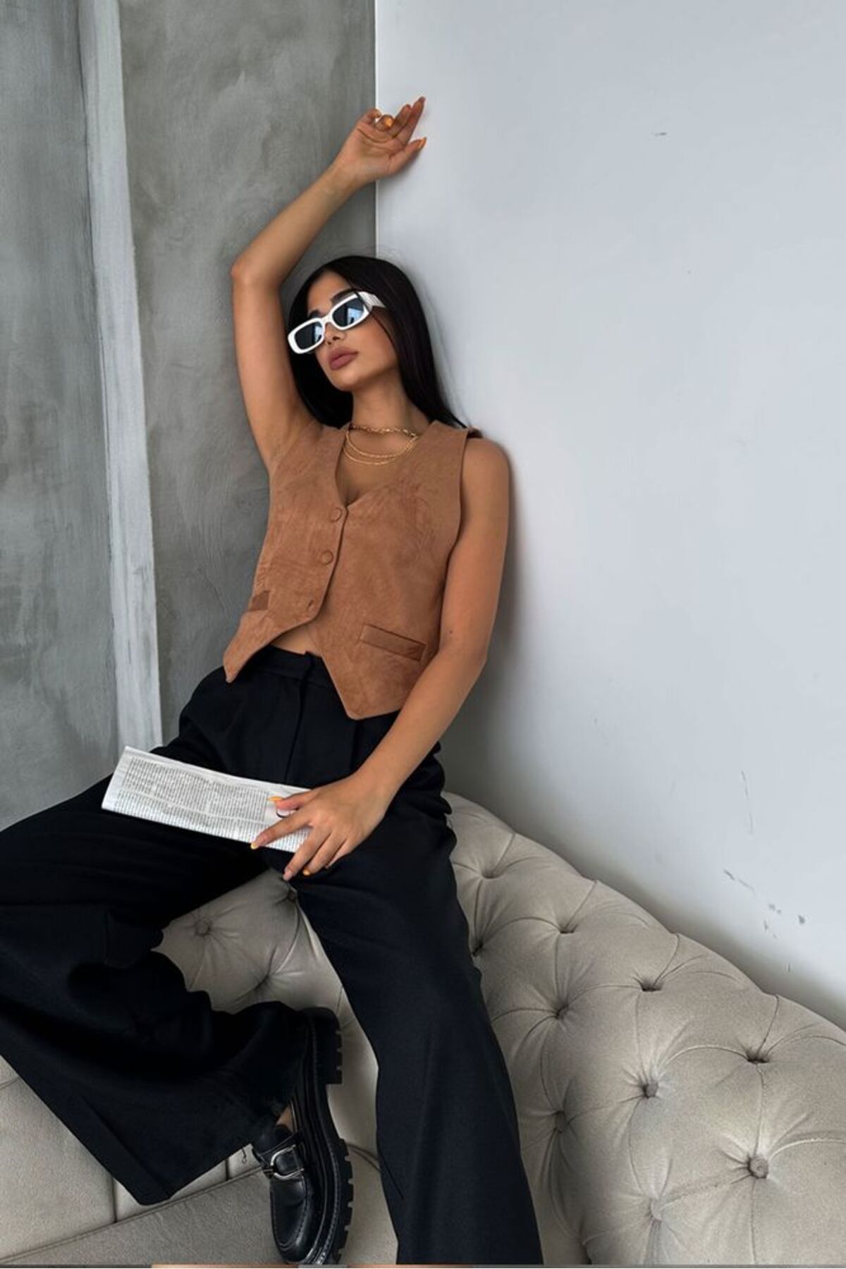 Kadın Süet Özel Tasarım Düğmeli V Yaka Yelek