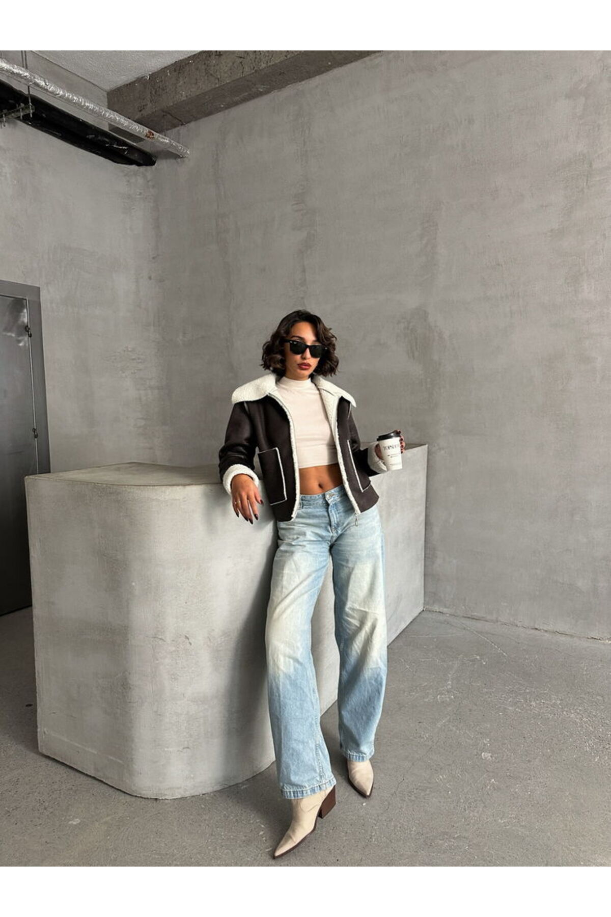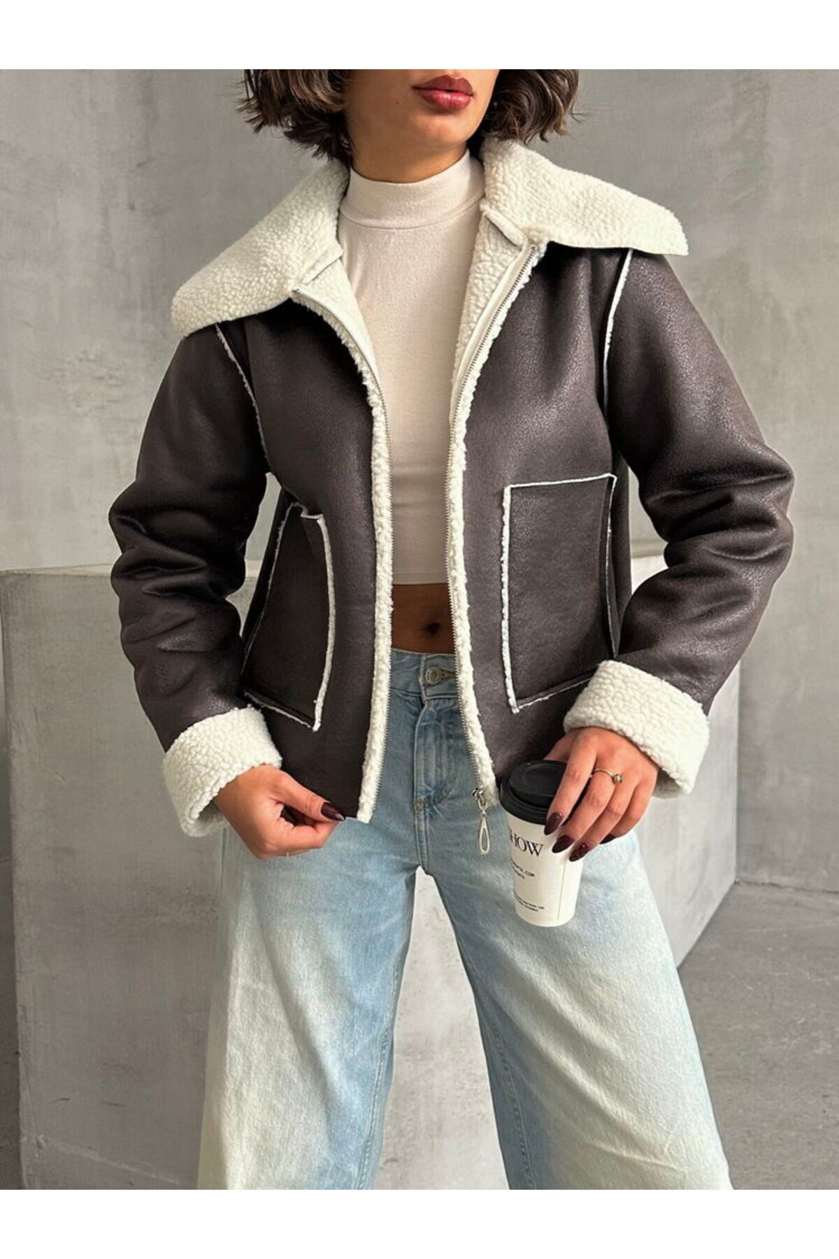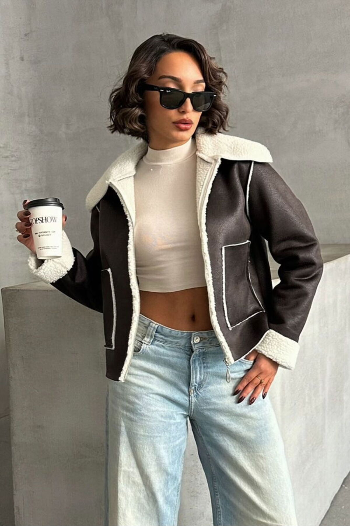 Haki Krem Kadın Peluş Süet Ceket Modern Premium Luxury Trend Tasarım Mont