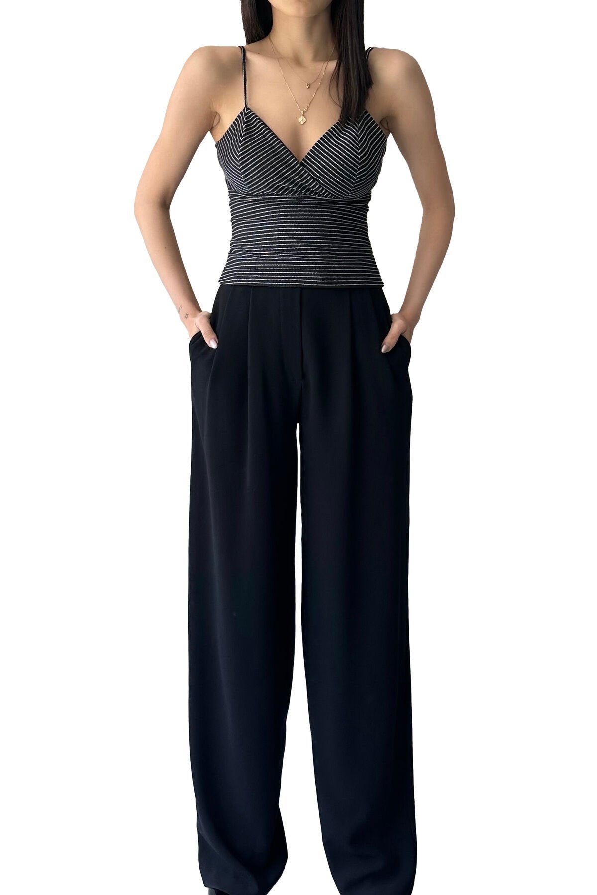 - Zarif tasarımıyla dikkat çeken bu crop bluz, kruvaze yaka detaylarıyla feminen bir görünüm sunar.; - Gri renk seçeneğiyle kolayca kombinlenebilen bu parça, günlük kullanım için idealdir.; - Çizgili deseniyle modern ve şık bir stil oluştururken, dokulu kumaşı konforlu bir deneyim sağlar.; - İnce yapısı sayesinde yaz ayları için hafif ve rahat bir alternatif olarak öne çıkar.; - Askılı kol tipi ile omuzları serbest bırakarak yaz günlerinde ferahlık hissi verir.; - Astarsız yapısıyla hafiflik kazandırırken, kemer takma ihtiyacını ortadan kaldırır.; - Cepsiz tasarımı pratik kullanım sunarken, klasik siluetiyle her gardıropta yerini almayı başarır.; - %95 polyester ve %5 likra karışımından oluşan materyali esneklik ve dayanıklılık vaat eder.; - Casual tarza uygun olarak tasarlanmıştır; günlük giyimde rahatlıkla tercih edilebilir.; - Makinede yıkanabilir olması bakımının kolay olmasını sağlar ve uzun süreli kullanım için idealdir.