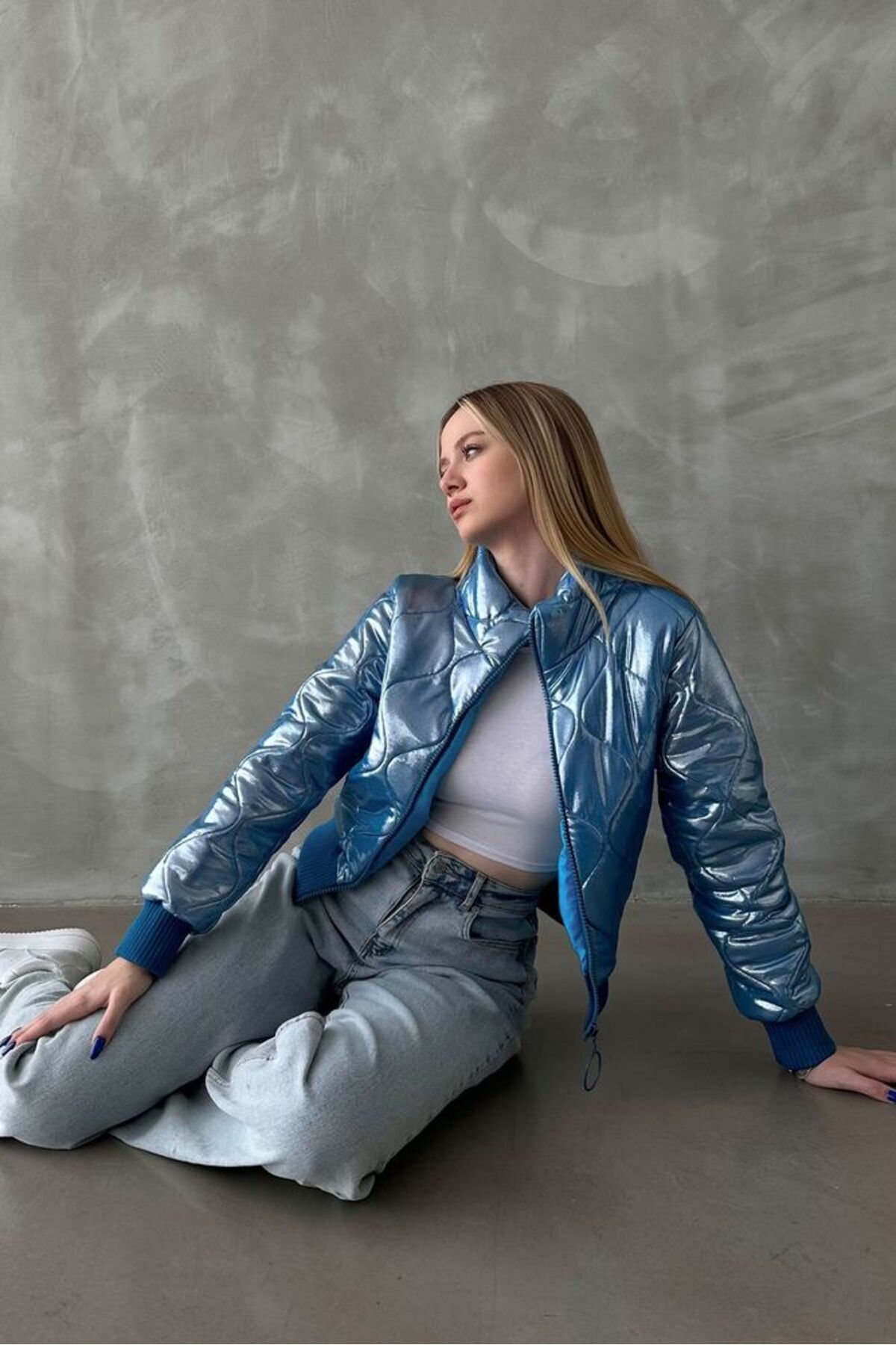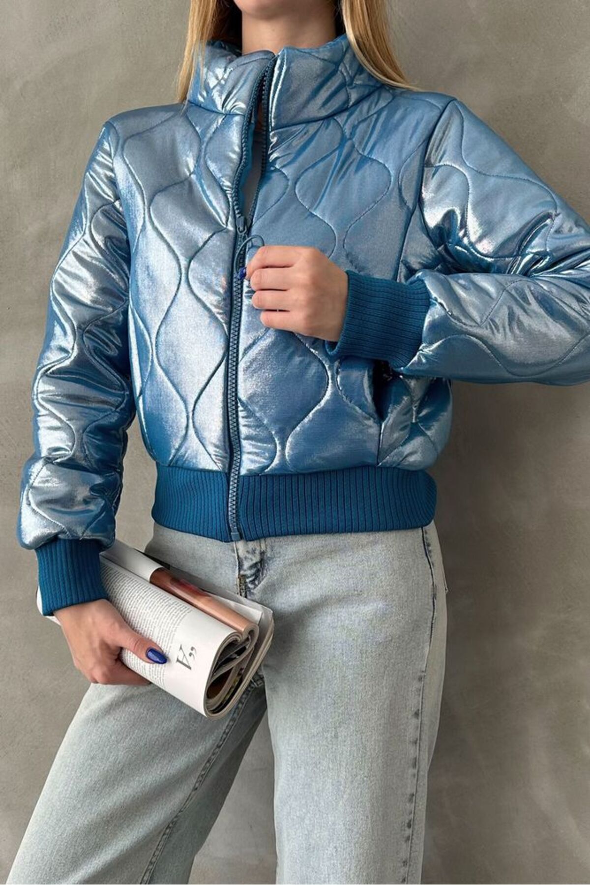 Mavi Parlak Kapitone Mont Modern Luxury Trend Tasarım Premium Mont