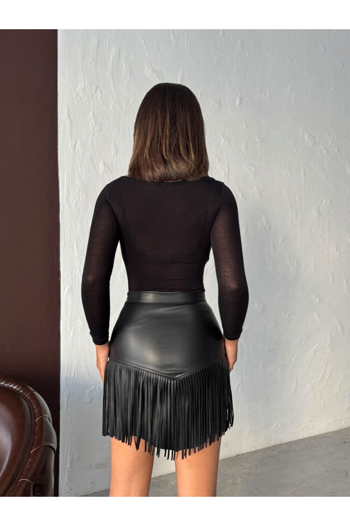 Siyah Western Tarz Püsküllü Mini Deri Etek Modern Premium Luxury Trend Tasarım Etek