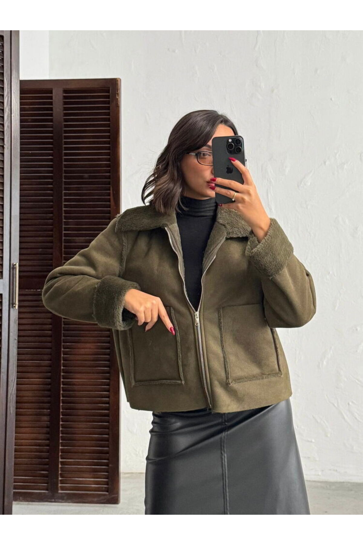 Haki Süet Tavşan Lamine Mont Modern Premium Luxury Trend Tasarım Mont