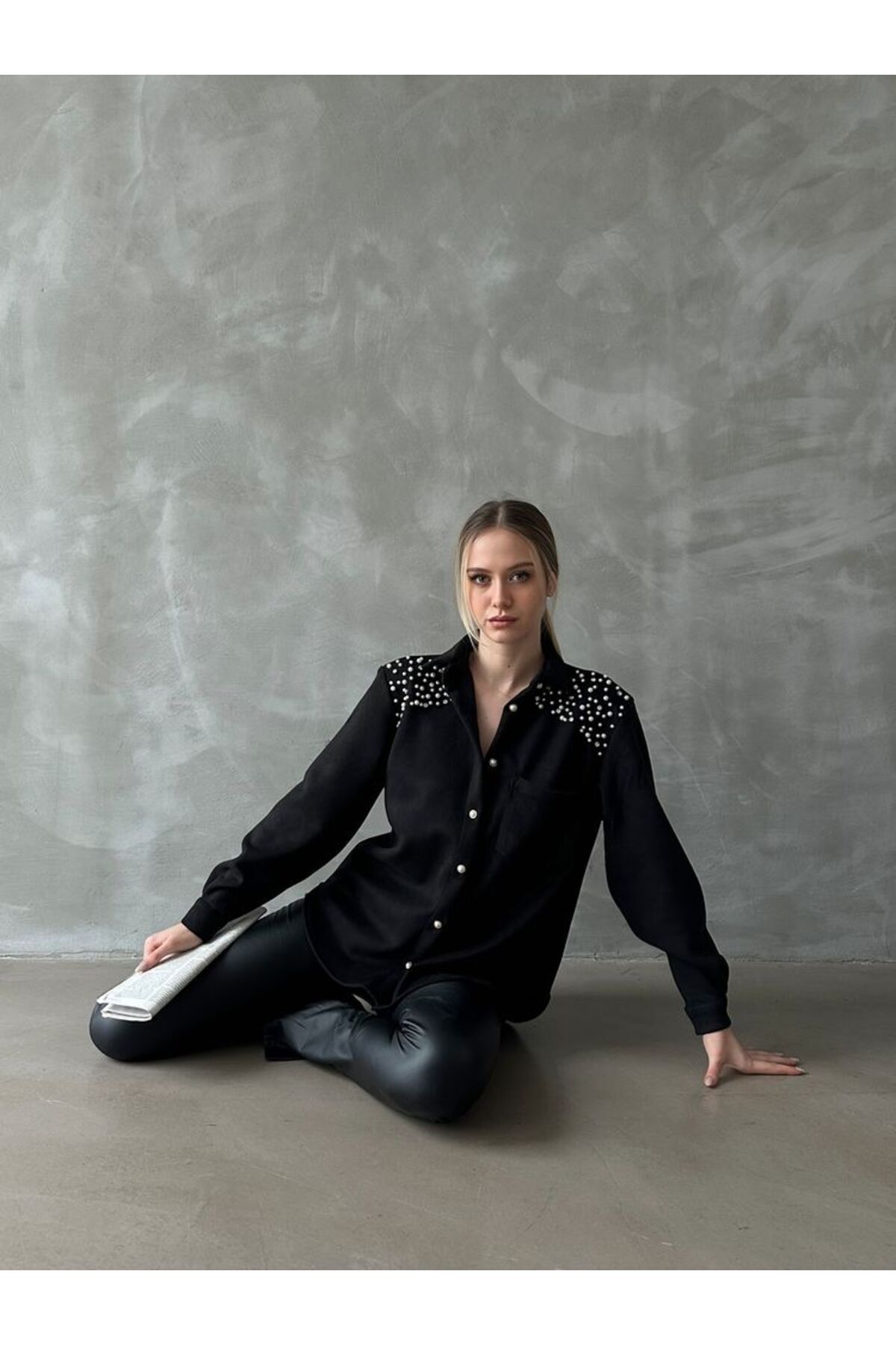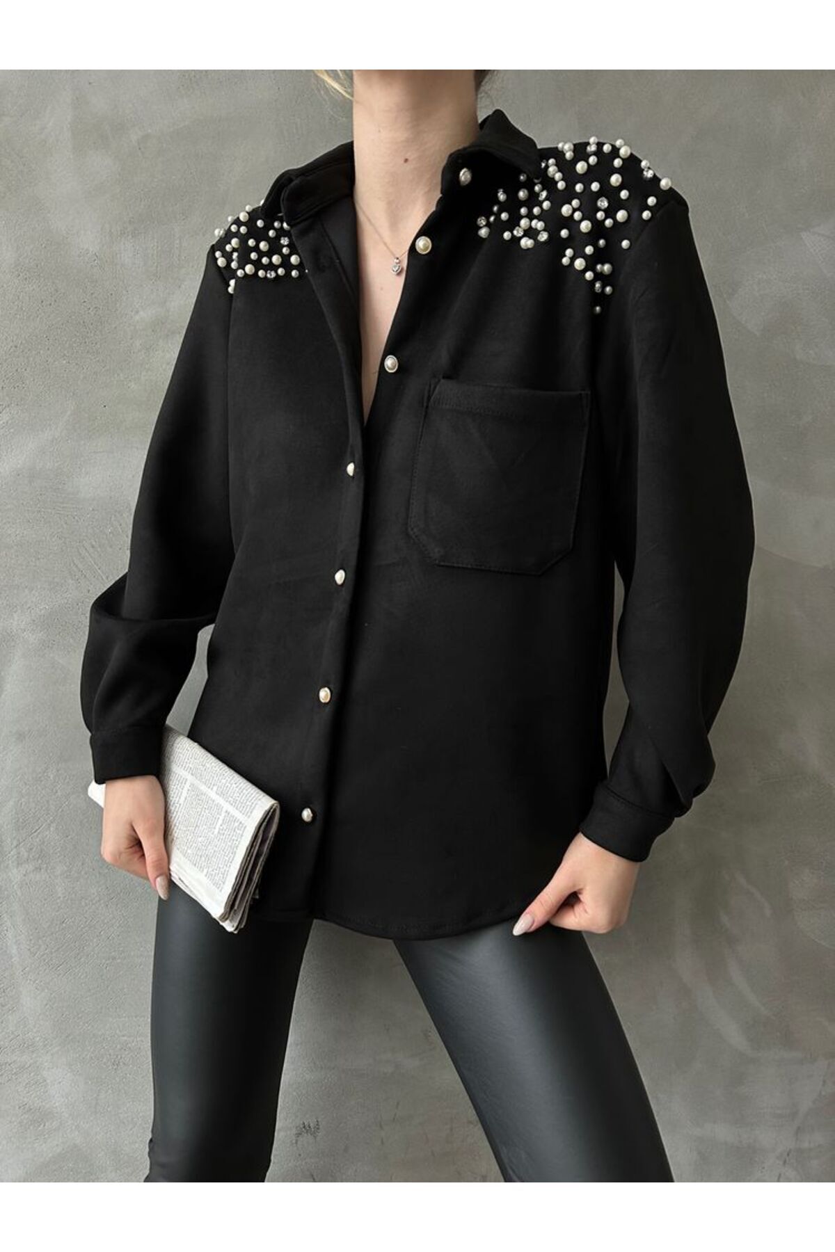 İnci Taşlı Aksesuarlı Kadın %100 Süet Uzun Kollu Gömlek
