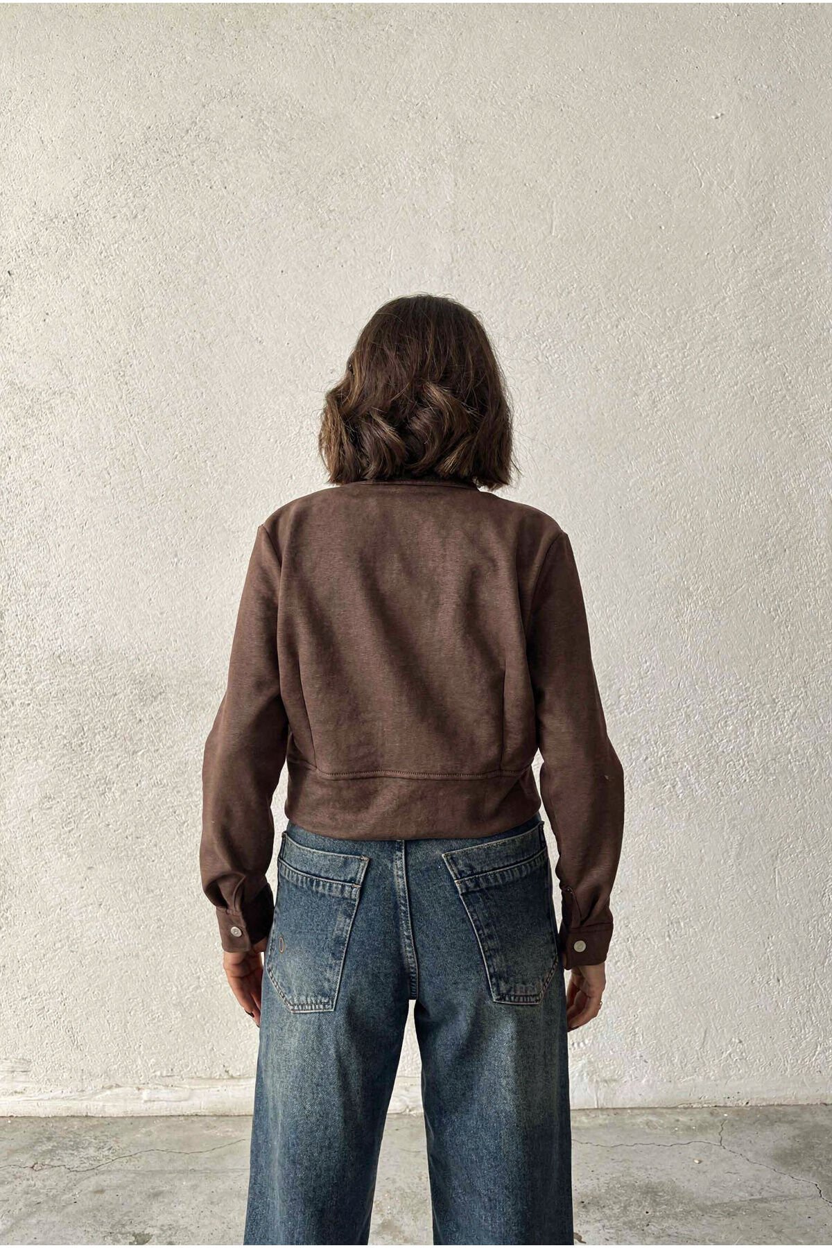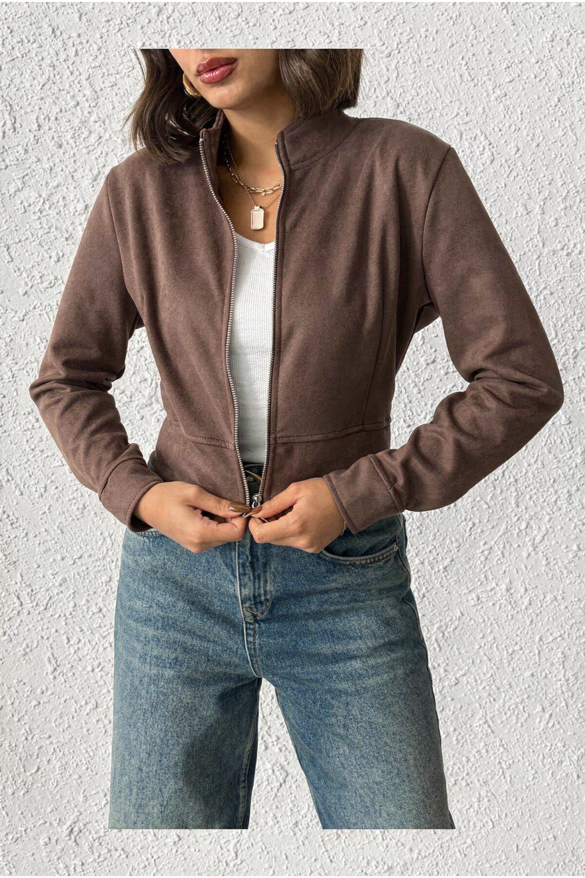 Kahve Süet Dik Yaka Crop Ceket Modern Premium Luxury Trend Tasarım Ceket