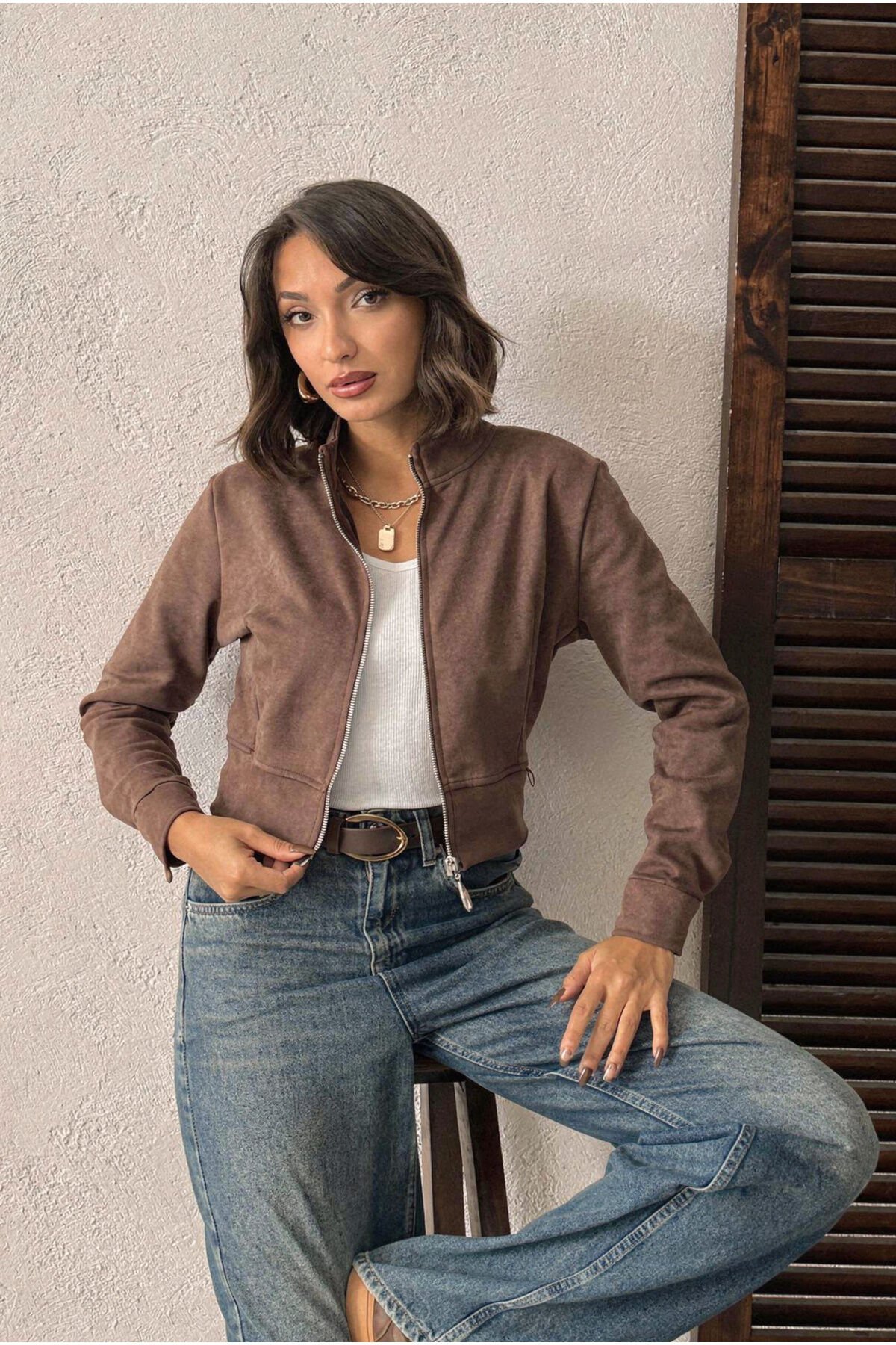 Ürün Özellikleri ve Avantajları: ? Premium Dokunuş: Yumuşak bitişli suni süet kumaşı sayesinde gün boyu konforlu ve şık bir his sağlar.; ?? Modern Kesim: Trend "Crop" (kısa) boyu ve vücudu saran kalıbı ile bel hattınızı ortaya çıkarır; yüksek bel pantolon ve eteklerle mükemmel uyum sağlar.; ?? Şık Tasarım: Dik yaka detayı ve gümüş renkli metal fermuarı ile spor-şık kombinlerinizin tamamlayıcısıdır.; ?? Mevsimlik Kullanım: Ne çok kalın ne çok ince yapısıyla bahar aylarında ve serin yaz akşamlarında ideal bir dış giyim tercihidir.; ?? Renk Seçenekleri: Siyah, Taba, Vizon, Taş, Bordo ve Kırmızı gibi geniş renk skalasıyla her tarza hitap eder.; Kombin Önerisi: Bu şık süet ceketi, kendi kumaşından mini eteklerle kombinleyerek takım şıklığı yakalayabilir veya Jean pantolon ve basic tişörtlerle günlük stilinizi bir üst seviyeye taşıyabilirsiniz.; Teknik Detaylar: Kumaş Tipi: Dokuma / Suni Süet Kalıp: Crop / Dar Kalıp (Vücuda Oturur) Yaka Tipi: Dik Yaka Kapama: Fermuarlı Kol Tipi: Uzun Kol Beden Seçenekleri: S - M - L