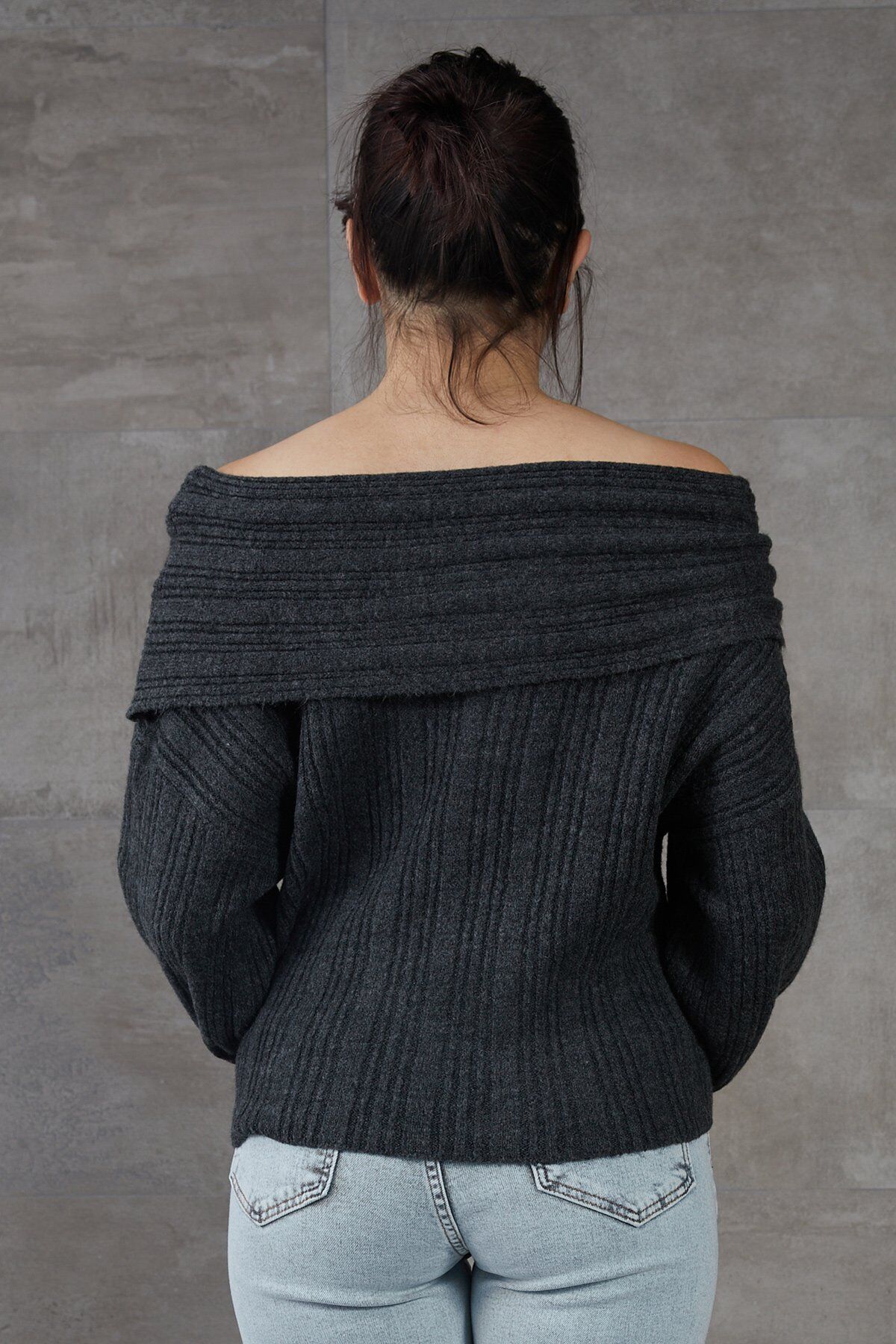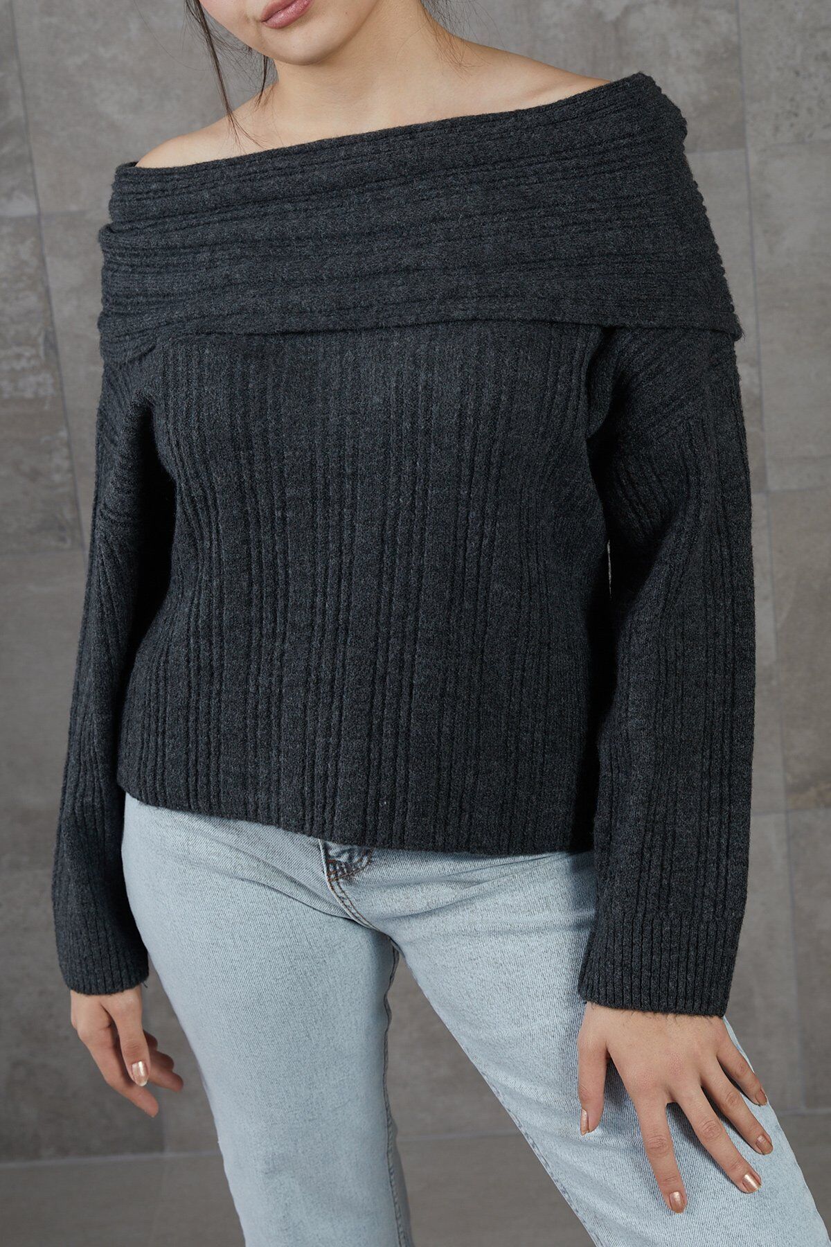 Antrasit Madonna Yaka Kolları Uzun Oversize Salaş Triko Kazak