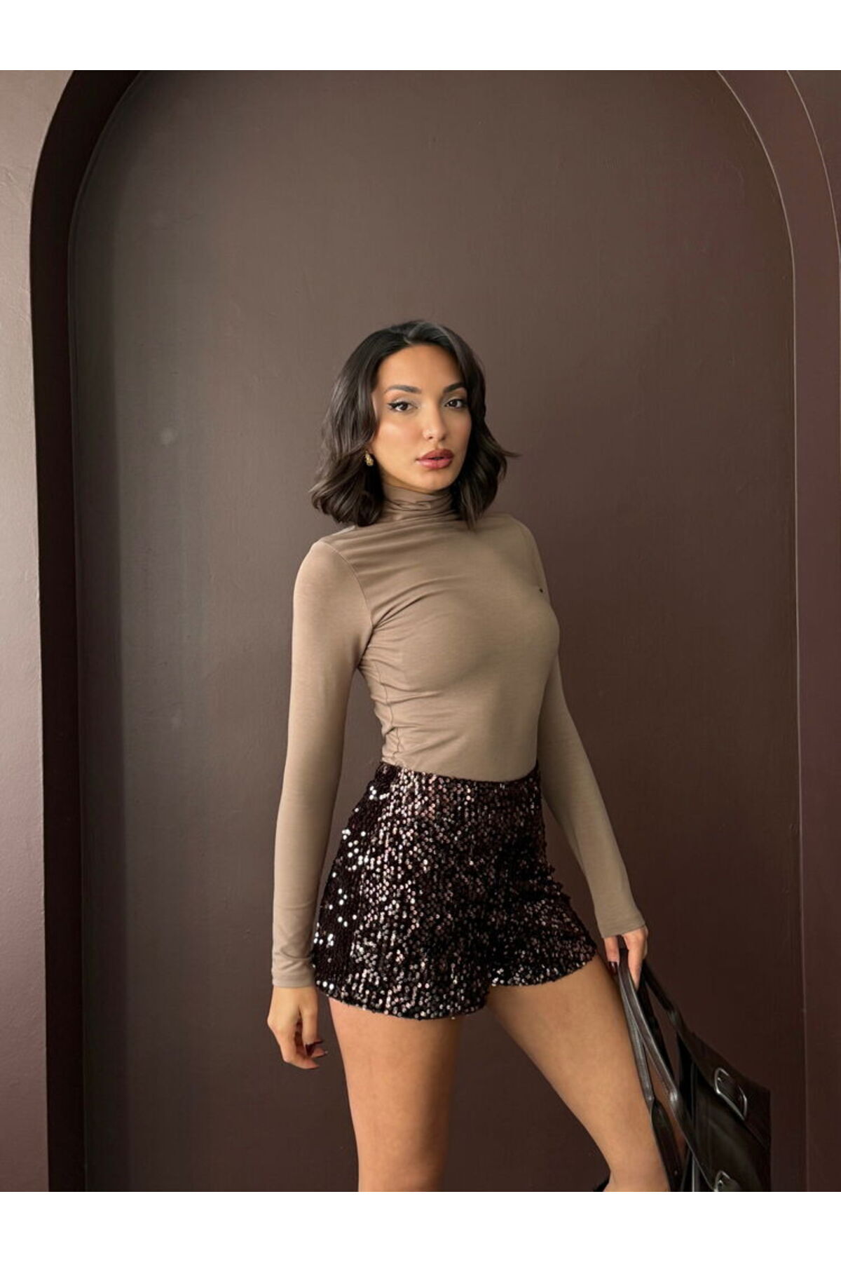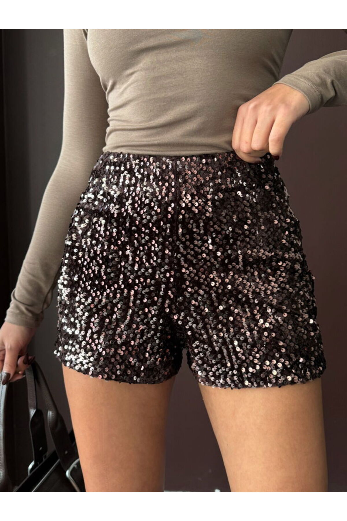 Kahverengi Pullu Kadife Şort Modern Premium Luxury Trend Tasarım Şort