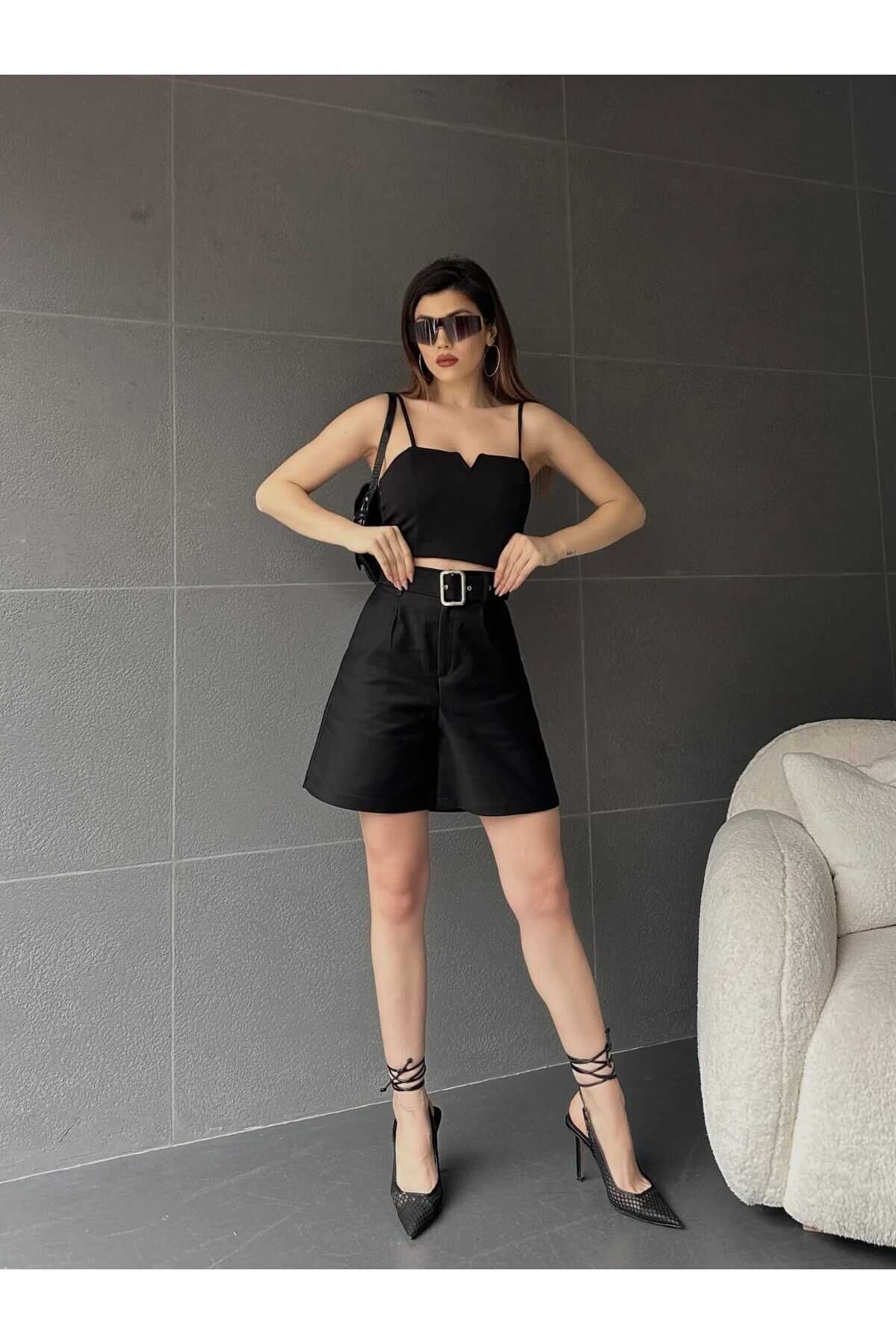 Kuş Gözü Kemerli Geniş Paçalı Mom Şort SİYAH RENK