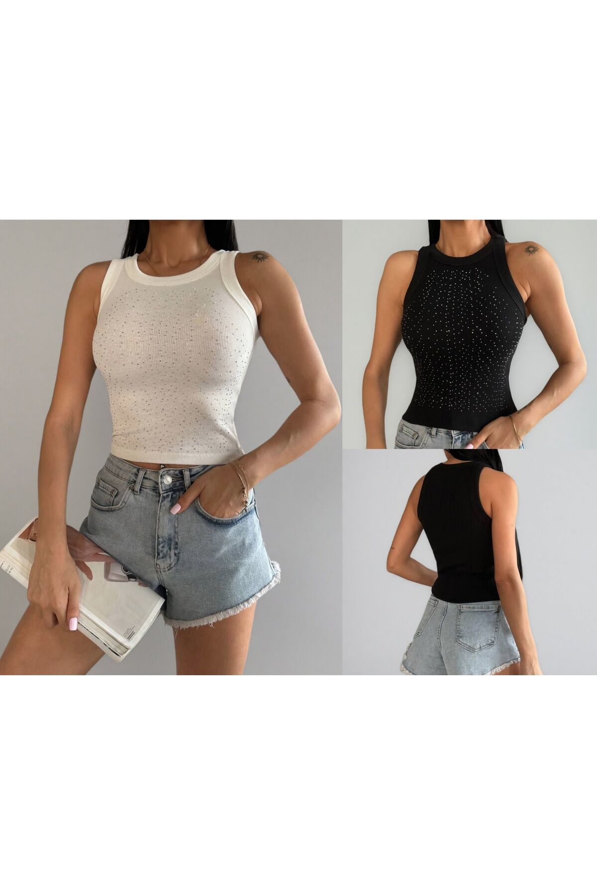 Taşlı Halter Yaka Kaşkorse Detaylı Kadın Crop Body Atlet