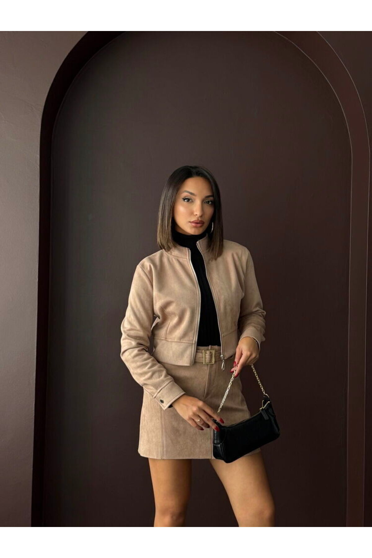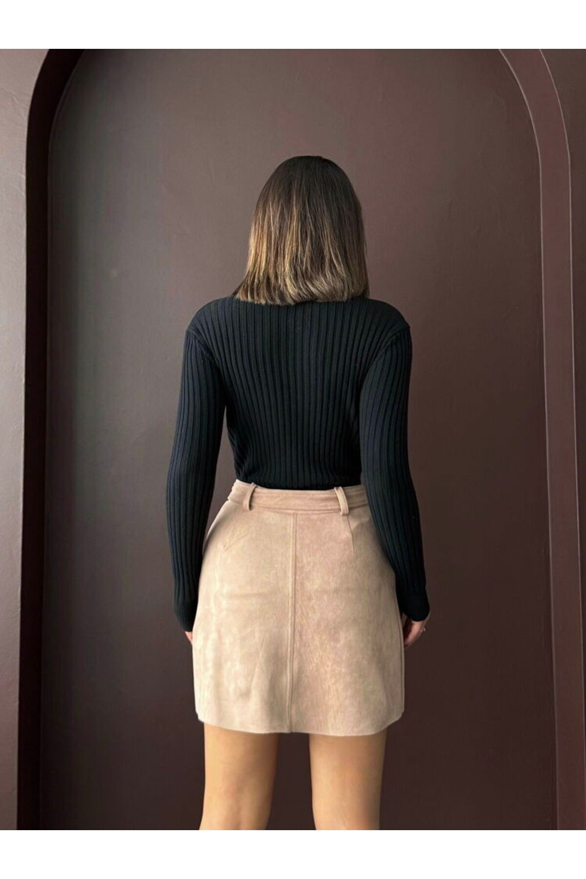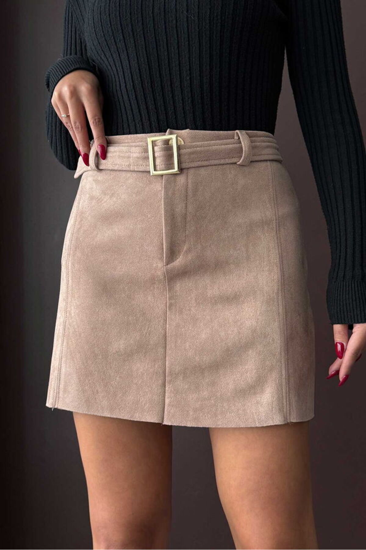 Vizon Kemerli Süet Etek Modern Premium Luxury Trend Tasarım Etek
