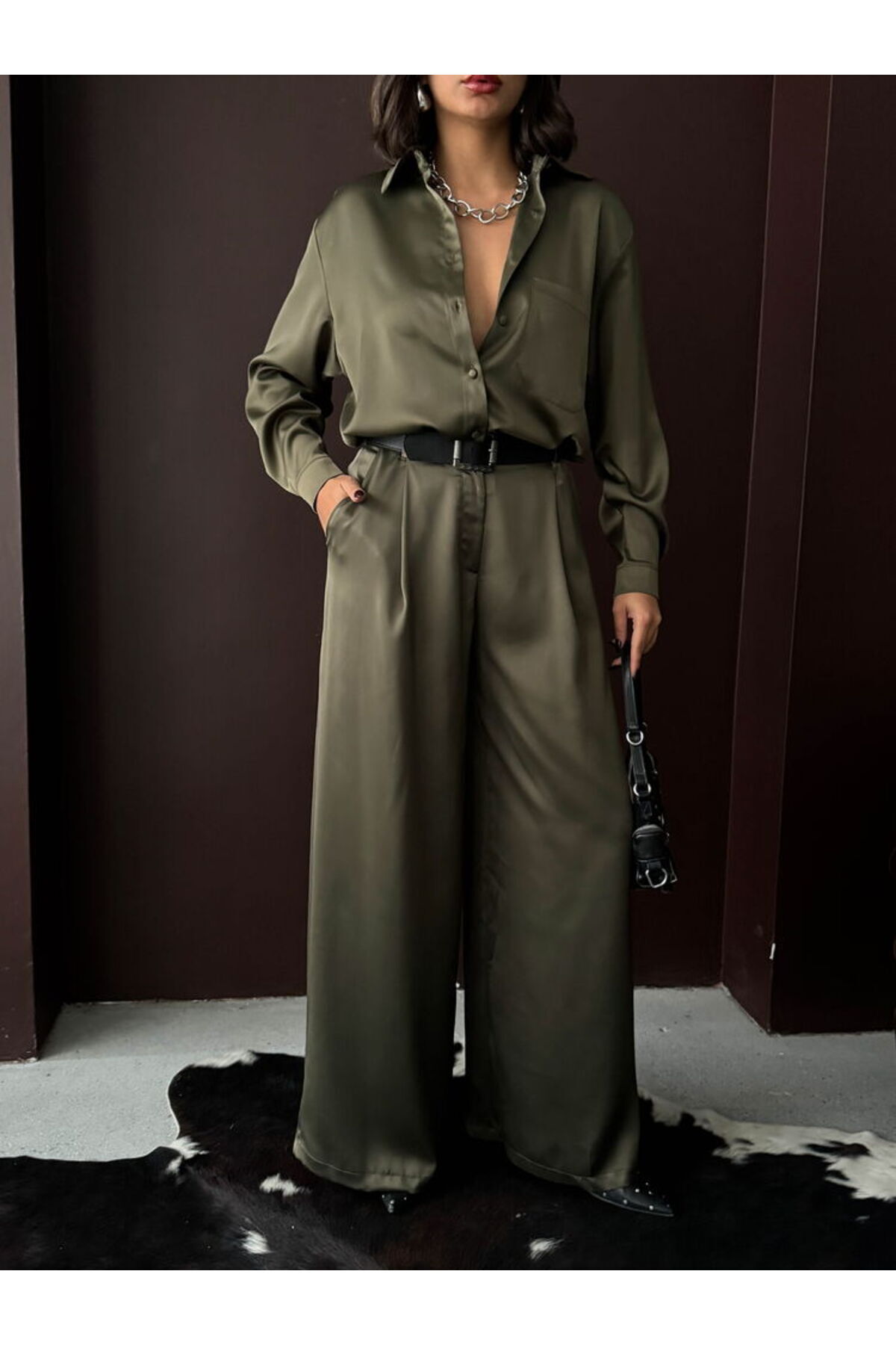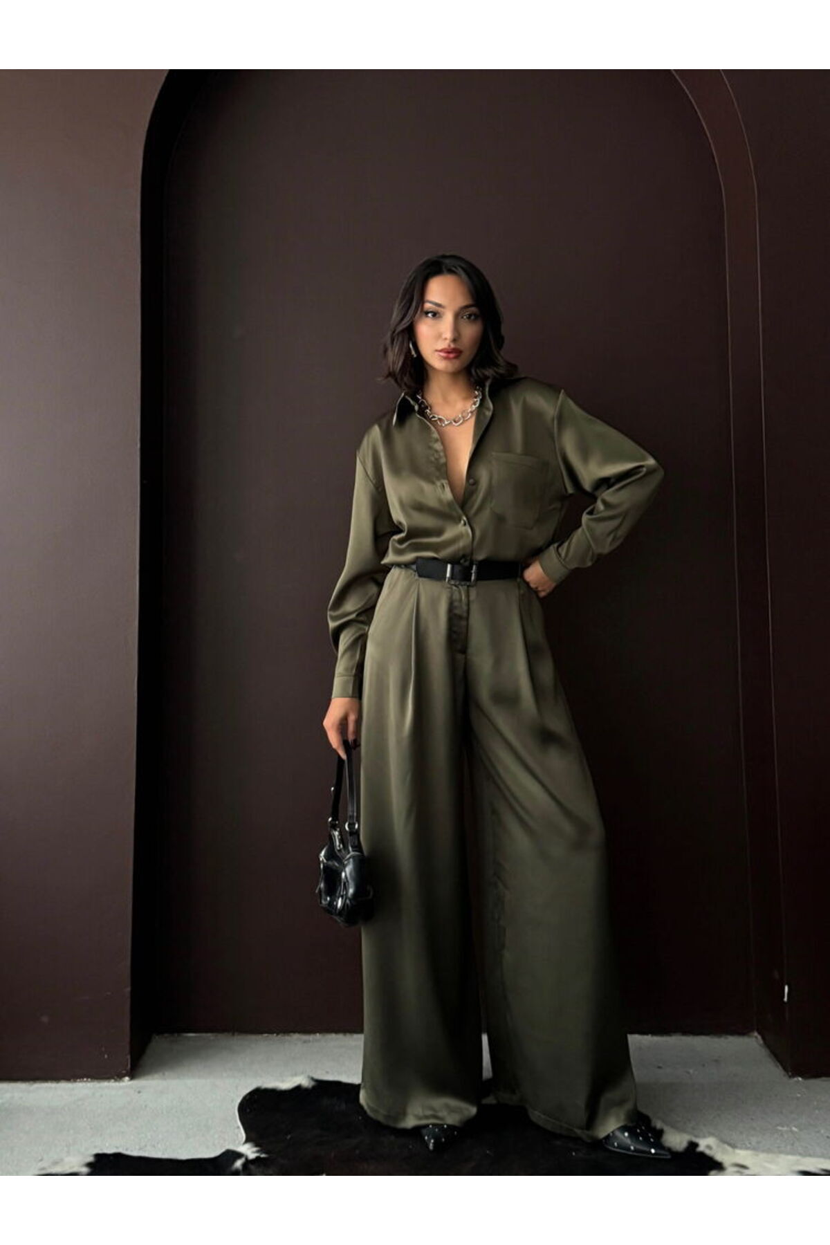 Haki Yüksek Bel Bol Paça Saten Pantolon Modern Premium Luxury Trend Tasarım Pantolon