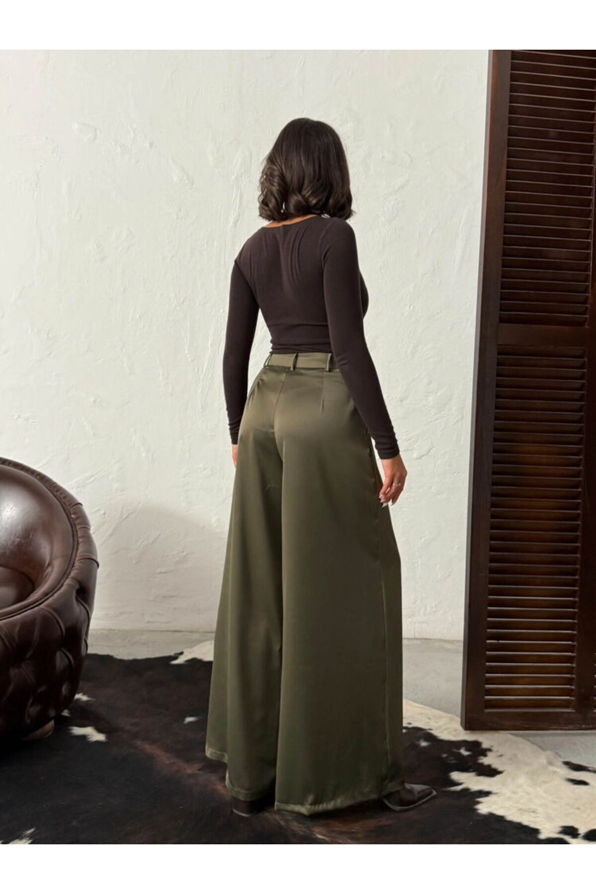 Haki Yüksek Bel Bol Paça Saten Pantolon Modern Premium Luxury Trend Tasarım Pantolon F2052S001-Haki