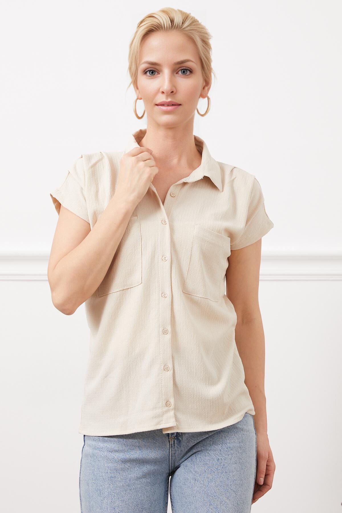 Raşel Çift Cepli Kadın Kısa Kollu Taş Gömlek