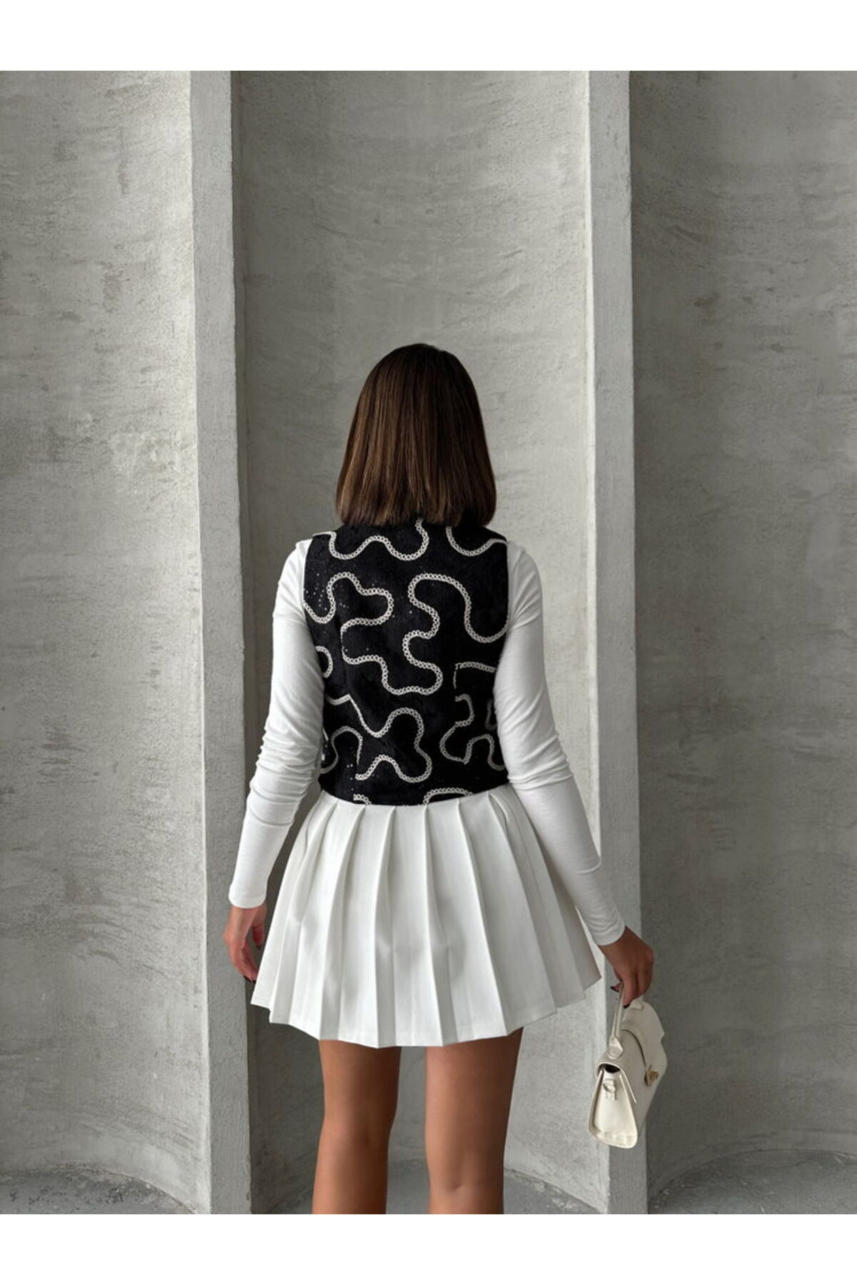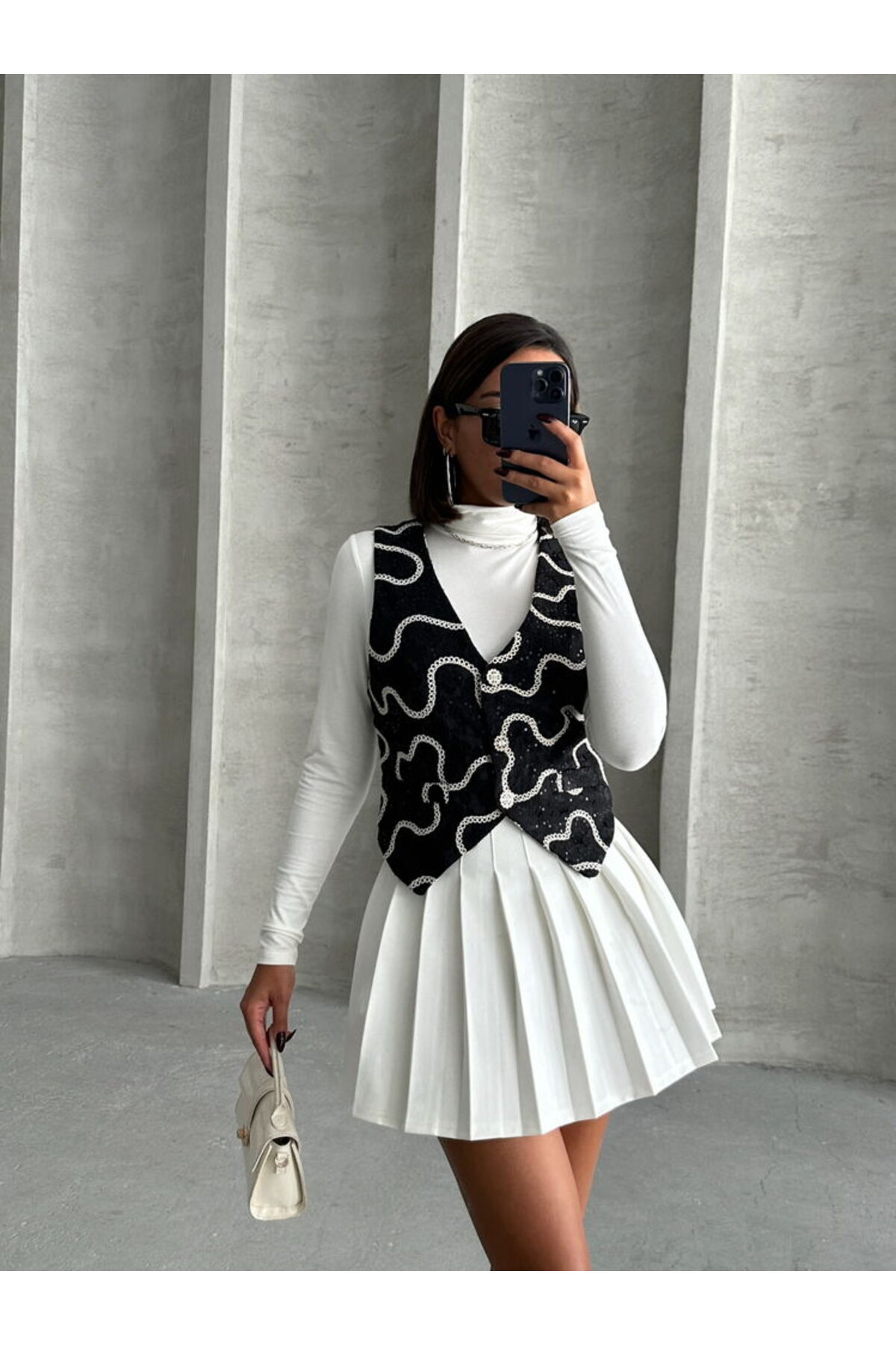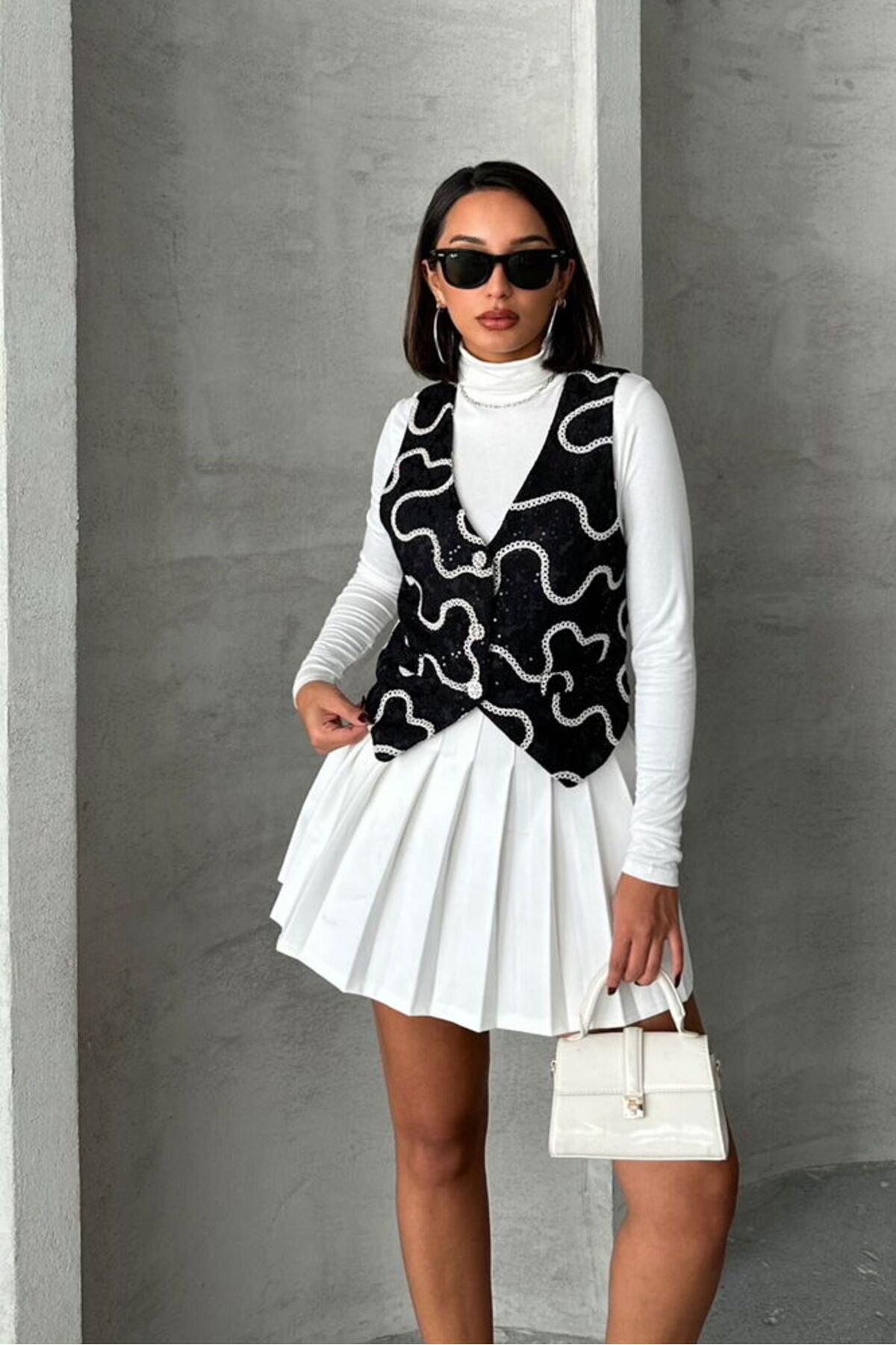 Stilinize Sanatsal Bir İmza: Sıradanlığın Dışına Çıkın!Klasik yelek formunu, modern ve sanatsal bir tasarımla yeniden yorumladık.; Siyahın asaleti üzerine işlenmiş, göz alıcı beyaz payet detaylarıyla bu yelek, sadece bir giysi değil, giyilebilir bir sanat eseri.; Gardırobunuzun en özel ve en dikkat çekici parçası olmaya aday bu tasarım, hem gündüz hem de gece stilleriniz için mükemmel bir tamamlayıcı.; İç astarının %100 pamuk olması sayesinde lüks görünümünü maksimum konforla birleştiren bu yelek, kalitesi ve eşsiz deseniyle yıllarca favoriniz olacak bir yatırım parçasıdır.; Girdiğiniz her ortamda stilinizle fark yaratmak için tasarlandı.; Neden Bu Yelek Benzersiz?Göz Alıcı Payet İşleme: Siyah zemin üzerinde kontrast yaratan, dalgalı formdaki beyaz payet veya boncuk işlemeleri, yeleğe lüks ve dinamik bir ışıltı katıyor.; %100 Pamuk Konforu: Dışı şık, içi %100 pamuk astarıyla cildinize dost ve gün boyu nefes alan bir konfor sunar.; Premium kaliteyi her dokunuşta hissedin.; Modern ve Klasik Kesim: Hem modern hem de zamansız bir silüet sunan V yaka, düğmeli ve klasik yelek kesimi, her vücut tipine zarifçe uyum sağlar.; Grafik ve Sanatsal Desen: Soyut ve akıcı deseniyle, monotonluğu kırar ve en sade kombinlerinize bile anında karakter katar.; Yüksek Kalite İşçilik: Her bir detayı özenle hazırlanmış, uzun yıllar gardırobunuzda kalacak şekilde tasarlanmıştır.; Öne Çıkan Özellikler (Maddeler Halinde):Stil: Modern, Şık, Sanatsal, Trend, LüksRenk: Siyah zemin üzerine Beyaz/Gümüş payet işlemeDesen: Grafik / Soyut / Dalgalı DesenDetay: Payet/Boncuk İşlemeli, Düğmeli, V YakaKumaş Tipi: Dış: Özel Dokuma Kumaş / İç Astar: %100 PamukKapanma Tipi: DüğmeliKalıp: Standart Kalıp (Regular Fit)Mevsim: Dört Mevsim (Katmanlı giyime uygun)Nasıl Kombinlenir?Maksimum Etki: Görseldeki gibi, içine giyeceğiniz beyaz bir balıkçı yaka kazak ve beyaz pileli etekle monokrom şıklığın zirvesine ulaşın.; Ofis Şıklığı: Beyaz bir gömlek ve siyah kumaş pantolon üzerine giyerek iş stilinize iddialı ve modern bir yorum katın.; Hafta Sonu Cool: Siyah bir tişört ve favori jean'inizle kombinleyerek gündelik görünümünüze anında bir ışıltı ve tasarım dokunuşu ekleyin.; Gece Işıltısı: Tek başına bir bluz gibi giyip, siyah deri bir pantolon veya saten bir etekle tamamlayarak gecenin yıldızı olun.; Bakım Talimatları:Ürünün üzerindeki payet ve işleme detaylarının hassasiyeti nedeniyle sadece profesyonel kuru temizleme (dry clean) önerilir.; Ütüleme gerekiyorsa, çok düşük ısıda ve tersten, işlemelerin üzerine bez koyarak yapılmalıdır.; Gardırobunuza eşsiz bir yatırım yapmak ve tüm bakışları üzerinize çekmek için bu özel tasarım yeleği hemen sepetinize ekleyin!