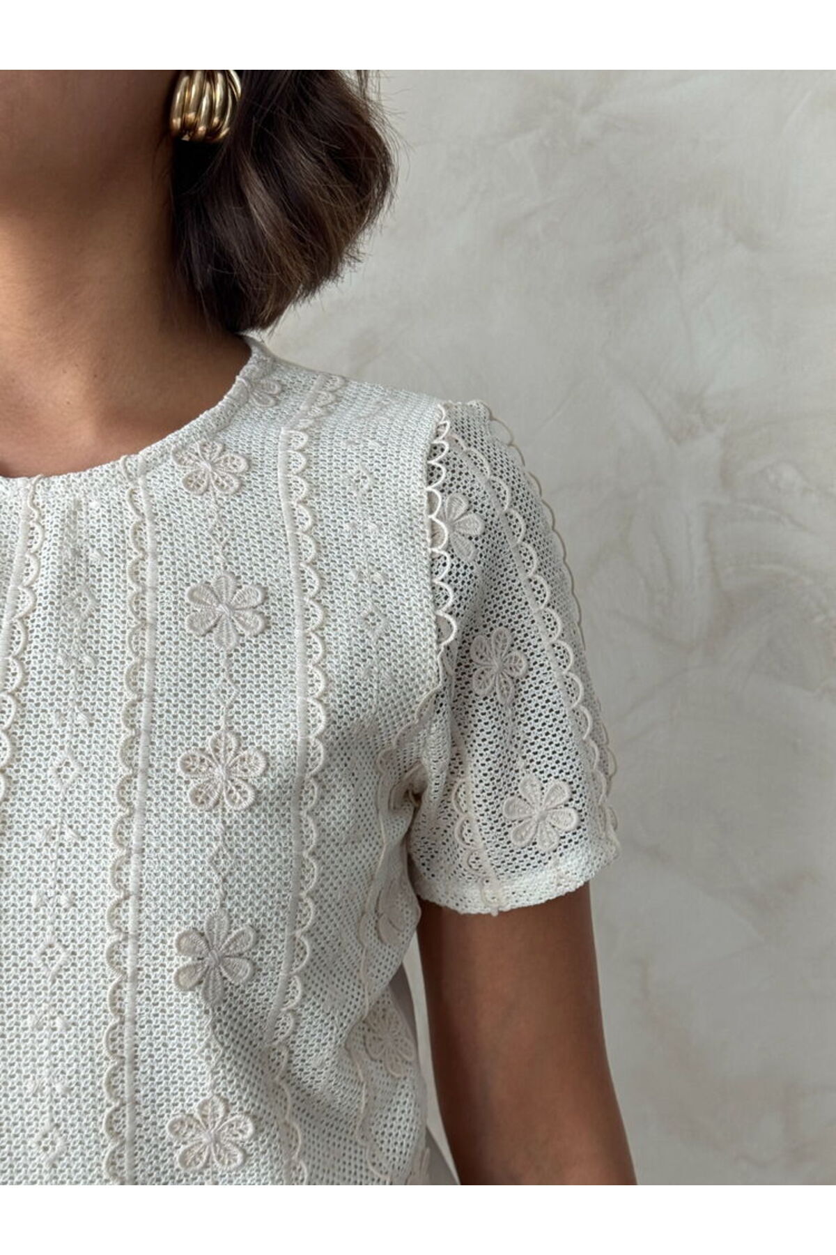 Nakışlı Dantel Bluz Modern Premium Luxury Trend Tasarım Doğallığın zarafetle, dantelin lüksle buluştuğu en özel tasarım! "Premium Luxury" koleksiyonumuzun nadide parçalarından olan Nakışlı Dantel Bluz, zamansız yuvarlak yaka kesimi ve büyüleyici el işçiliği görünümlü nakışlarıyla stilinize asil bir dokunuş katıyor.; Hem bohem hem de modern çizgileri bir arada sunan bu bluz, gardırobunuzun en seçkin parçası olacak.; Öne Çıkan Tasarım Detayları: - Premium Pamuklu Dokusu: Yüksek kaliteli %100 pamuklu içeriği sayesinde cildinize nefes aldırır, gün boyu doğal bir konfor ve ferahlık sağlar.; - Zarif Nakış ve İşlemeler: Ürünün her detayına işlenmiş naif nakışlar, tasarıma "Hand-made" (el işçiliği) estetiği ve derinlik katar.; - Modern Yuvarlak Yaka: Minimalist yuvarlak yaka ve kısa kol tasarımı, dantelin romantik havasını modern şehir stiline uyarlar.; - Relaxed (Rahat) Kalıp: Vücudu kısıtlamayan dökümlü yapısı sayesinde eforsuz bir şıklık sunar, her vücut tipine mükemmel uyum sağlar.; - İç Göstermeyen Özel Doku: Kaliteli dokuma tekniği sayesinde dantel zarafetini güvenli ve konforlu bir kullanım deneyimiyle birleştirir.; Teknik Bilgiler: - Materyal: %100 Pamuklu Premium Dantel - Yaka Tipi: Yuvarlak Yaka - Kol Tipi: Kısa Kol - Kalıp: Relaxed / Rahat Kesim - Kumaş Tipi: Dantel / Dokuma - Detay: Nakışlı / İşlemeli / Dantel Detaylı - Sezon: Yaz / Bahar - Stil: Modern, Luxury, Trend, Bohem - Kullanım Alanı: Günlük Şık, Ofis Şıklığı, Tatil/Resort Modu, Özel Buluşmalar Kombin Önerisi: Bu nakışlı bluzu, koleksiyonumuzdaki "Yüksek Bel Bol Paça Saten Pantolon" ile kombinleyerek doku kontrastı yaratabilir veya jean şortlarla eşleştirerek şık bir festival stili oluşturabilirsiniz.; Bakım Talimatı: Nakışların ve pamuklu dantel dokusunun formunu uzun süre koruması için ürünü ters çevirerek düşük ısıda hassas yıkama yapmanız veya koruyucu file kullanmanız önerilir.; Zarafeti ve doğal lüksü üzerinizde taşımak için "Nakışlı Dantel Bluz" modelini hemen sepetinize ekleyin!
