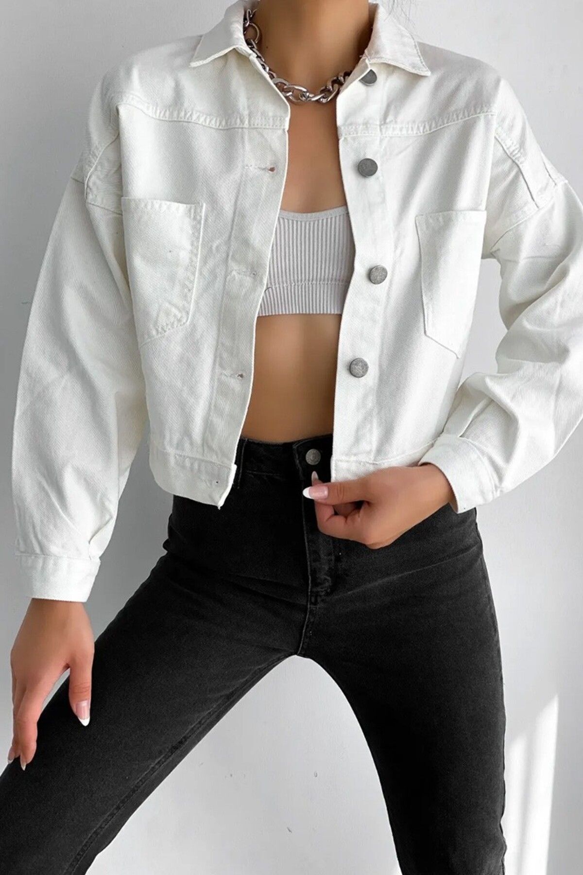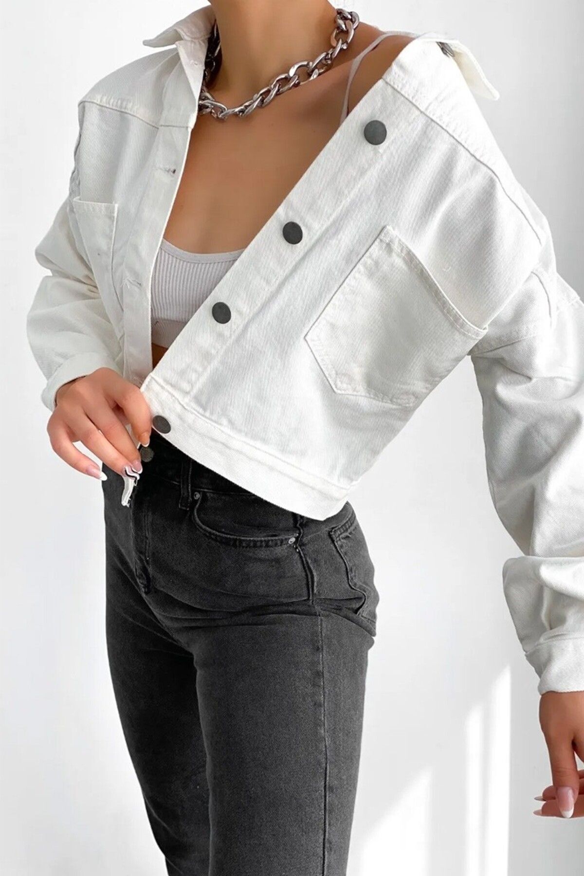 Çift Cepli Crop Yıkamalı Siyah-Beyaz Denim Jean Kot Kadın Ceket