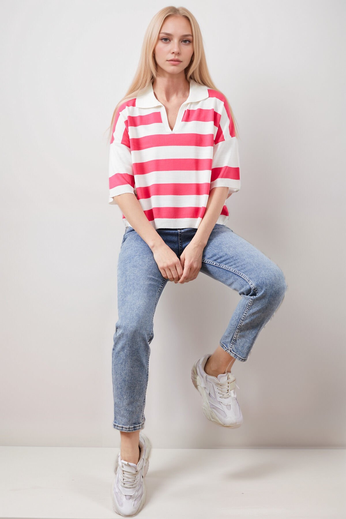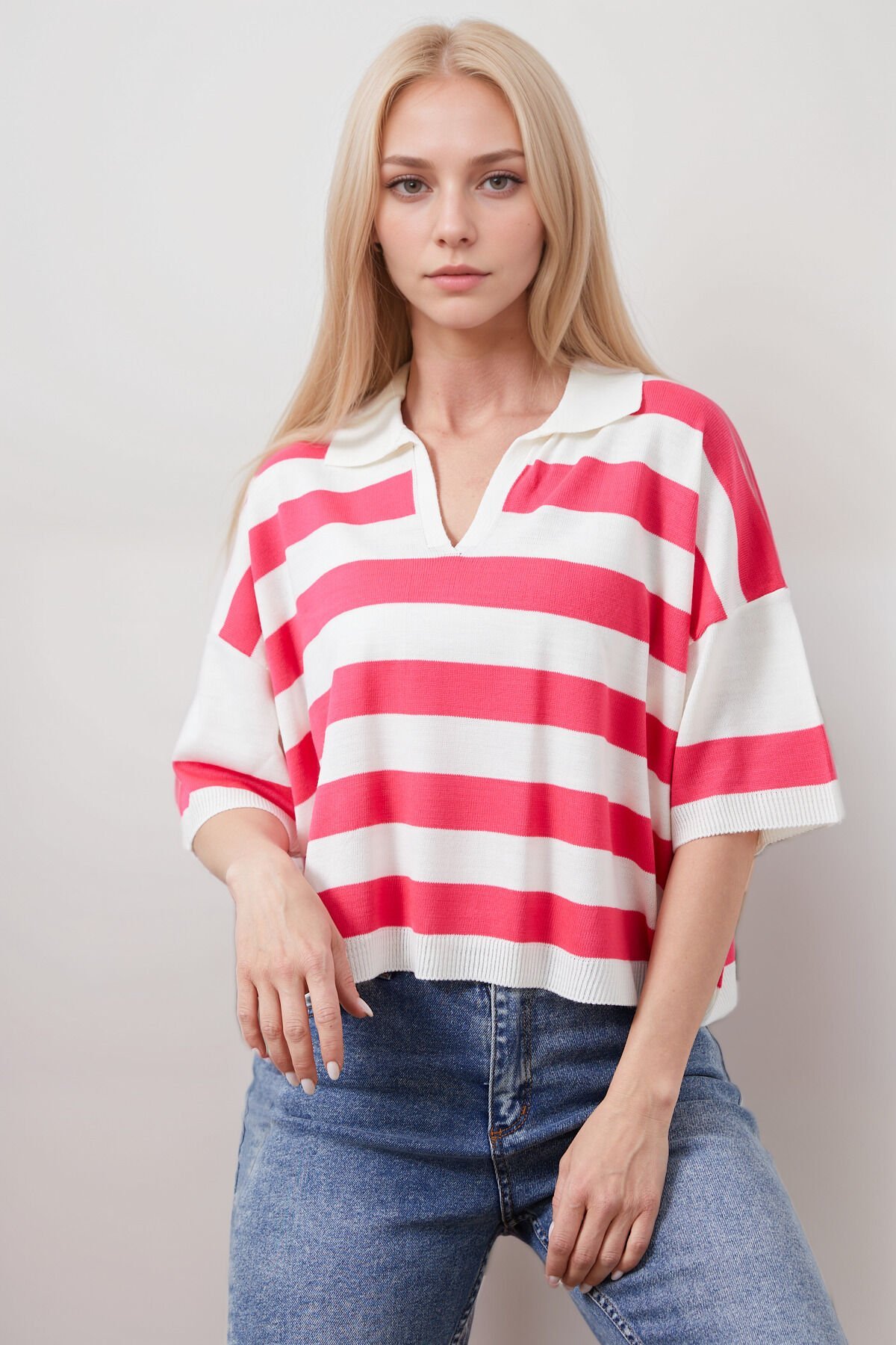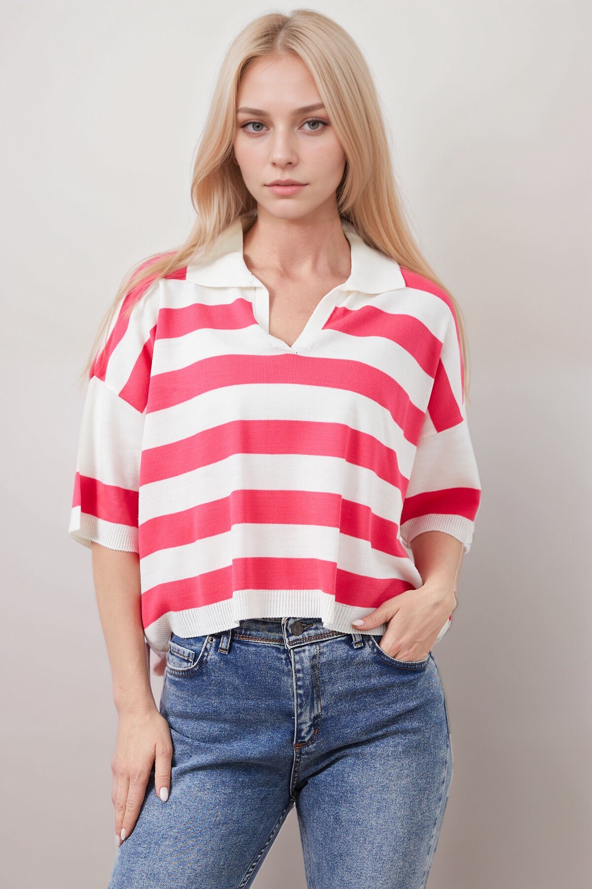 Gömlek Yaka Kadın Pembe Çizgili Triko