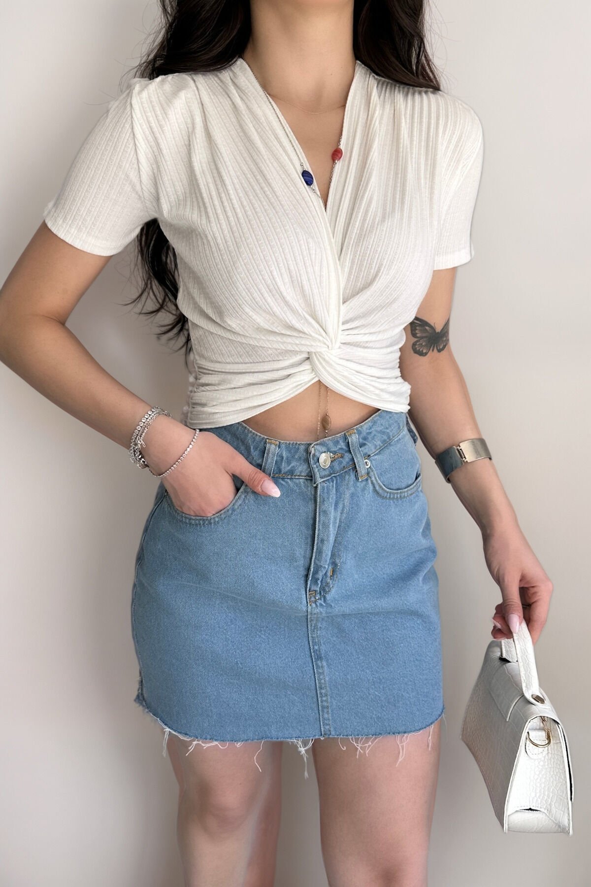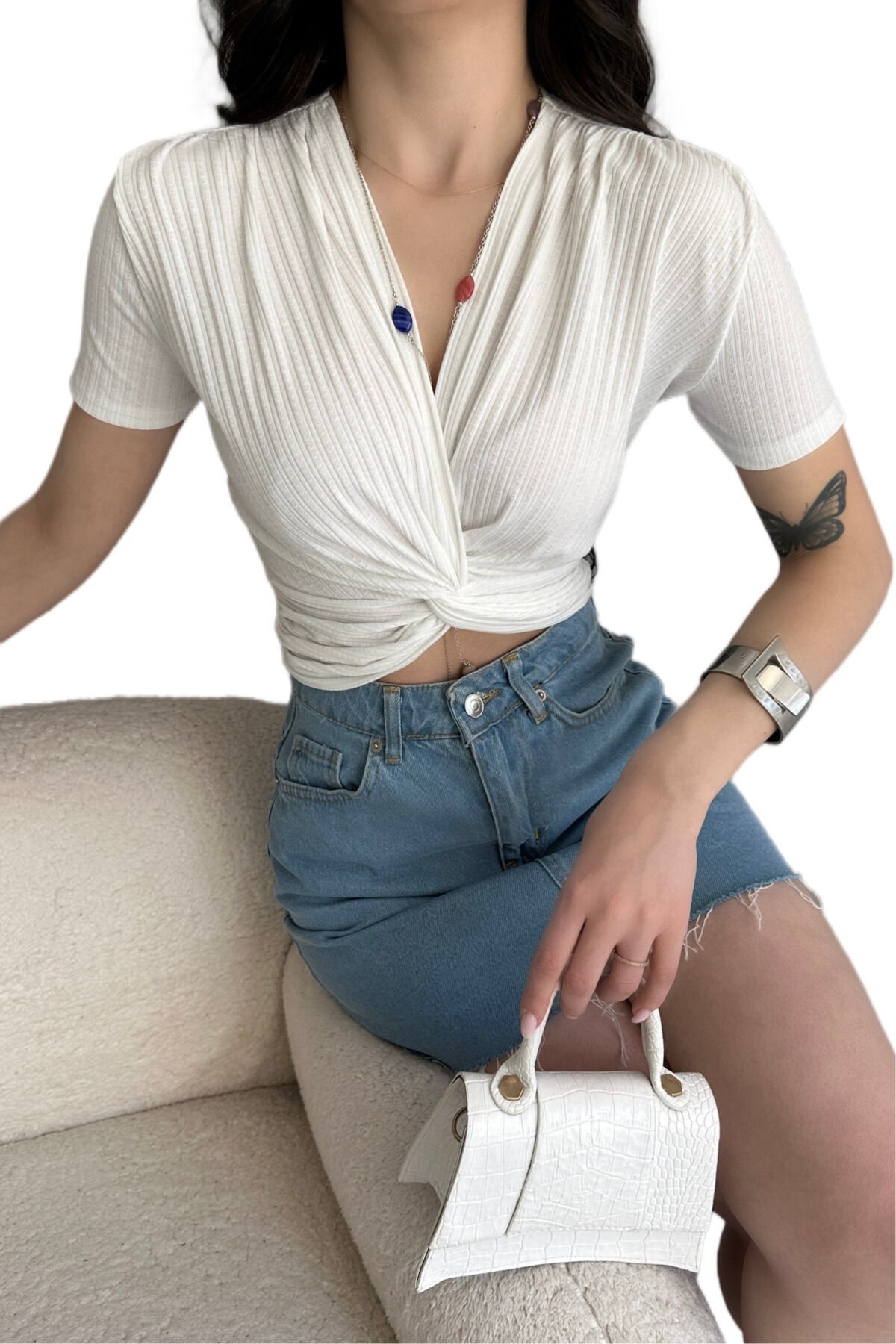 Kruvaze Yaka Fitilli Siyah Kadın Crop Bluz