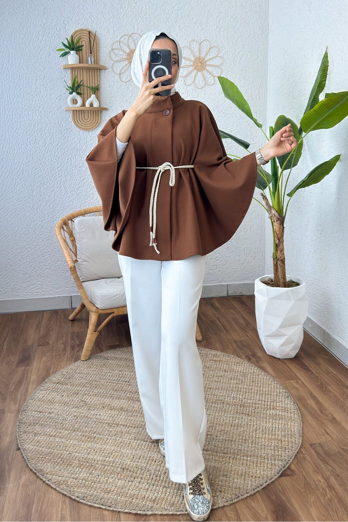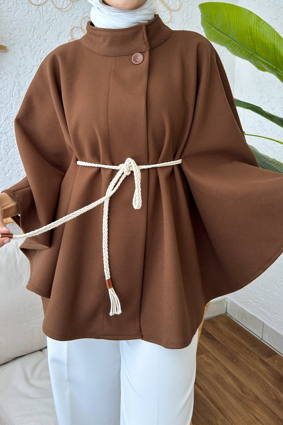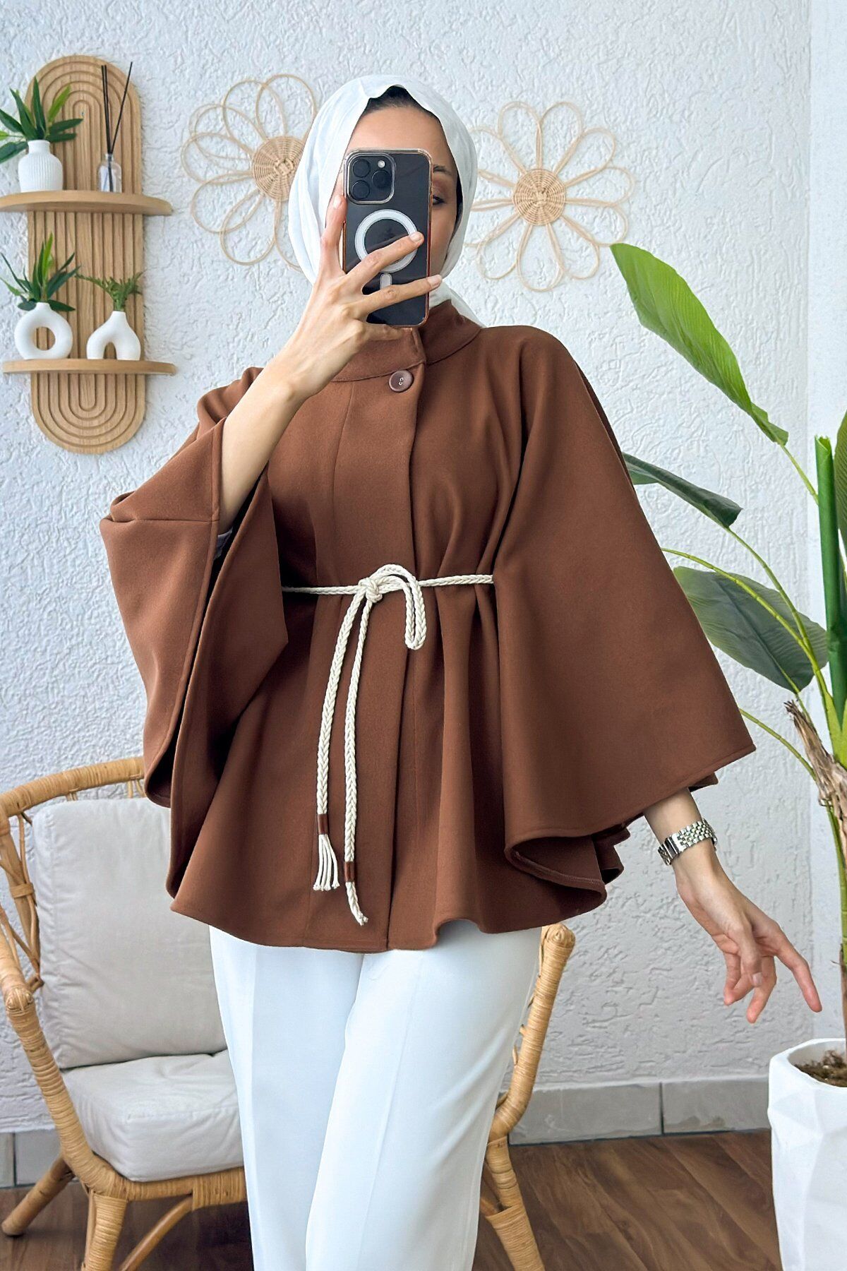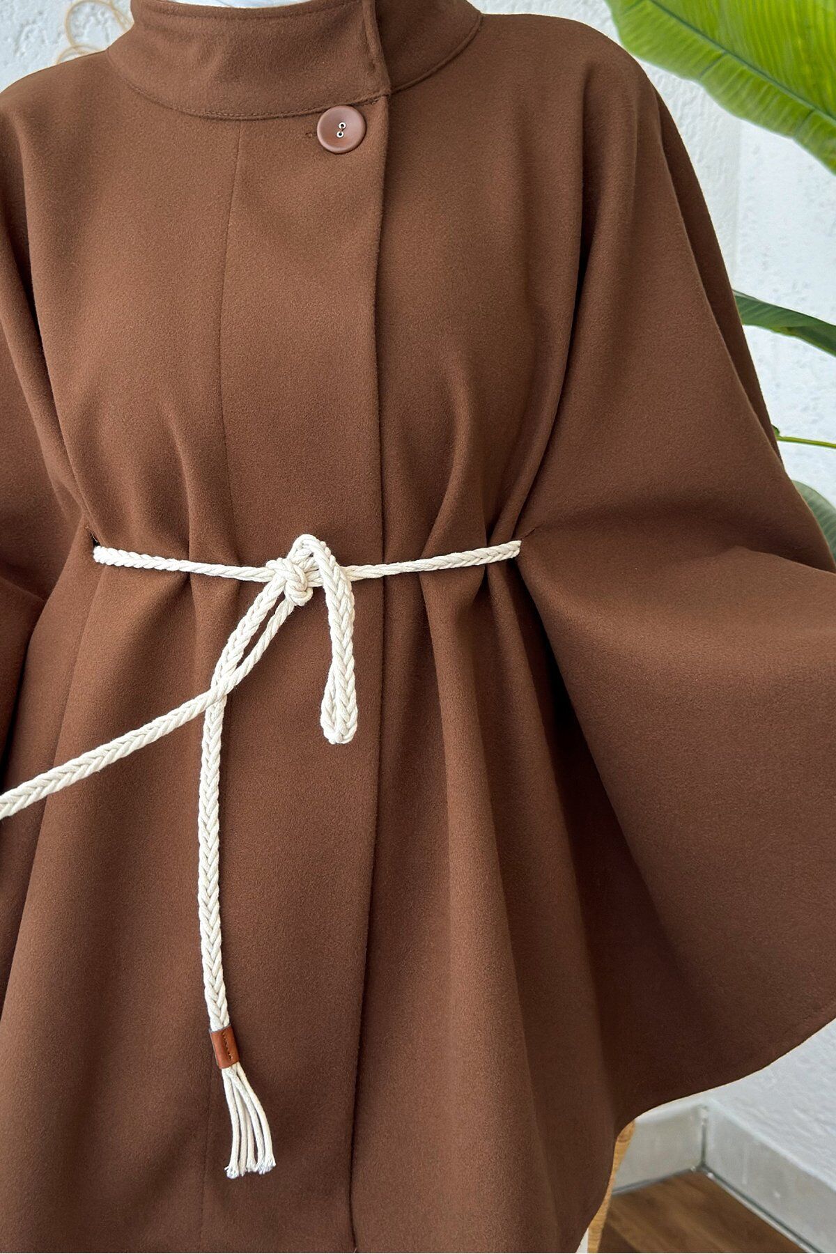 Örgü Kuşaklı Kaşe Kumaş Kadın Kışlık Trend Premium Luxury Şık Düğmeli Panço