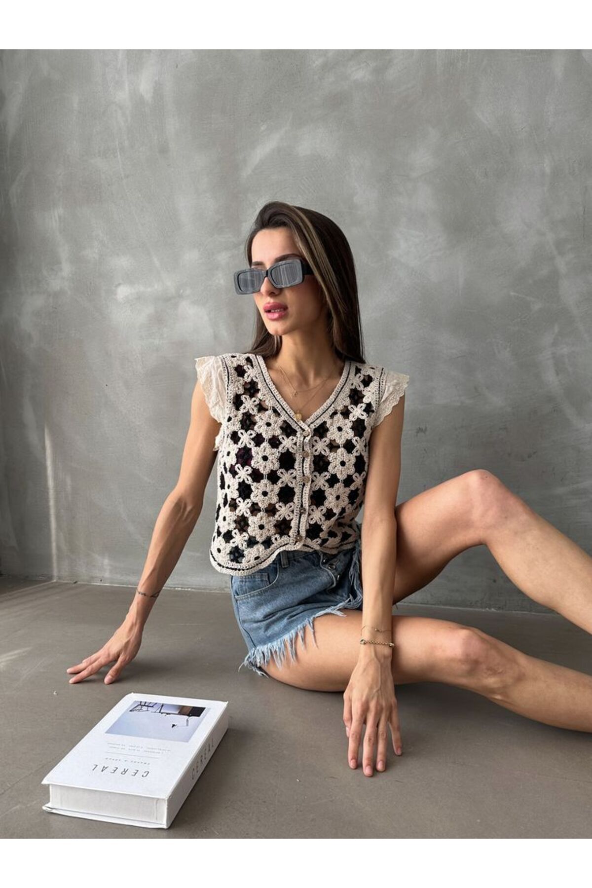 Taş Çiçek Desenli Örme %100 Pamuk Kadın Premium Luxury Trend Tasarım Düğmeli Yelek