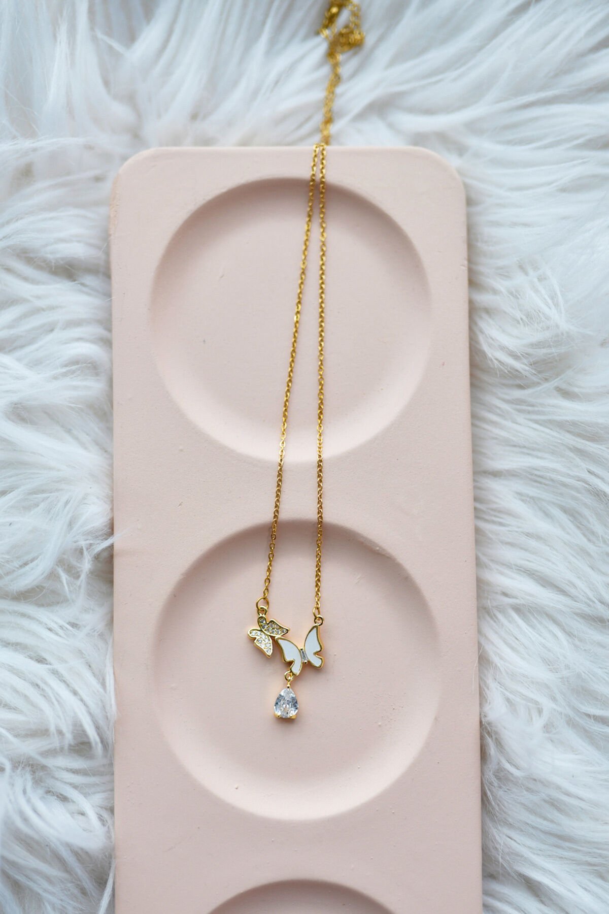 Taşlı Kelebek Çelik Kolye Gold Renk Paslanmaz Kararmaz