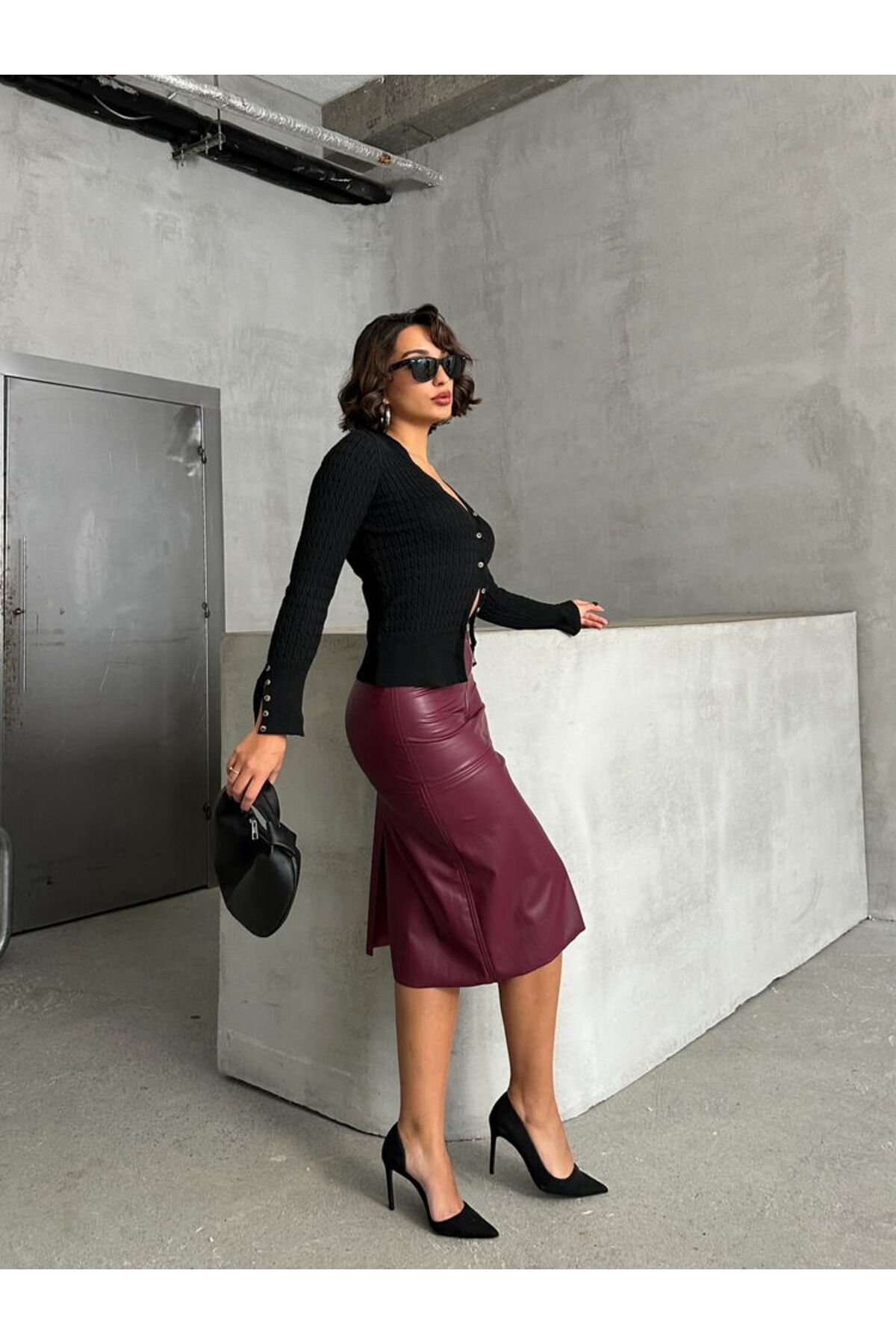 **Yüksek Bel Fermuarlı Yırtmaçlı Suni Deri Midi Kalem Etek** Modern silüeti ve iddialı detaylarıyla stilinizi bir üst seviyeye taşıyacak **Yüksek Bel Fermuarlı Yırtmaçlı Suni Deri Midi Kalem Etek**, gardırobunuzun en joker parçası olmaya aday.; Hem ofis şıklığında hem de akşam davetlerinde kusursuz bir görünüm sunan bu etek, vücut hatlarını zarifçe ortaya çıkaran kalem kesimiyle dikkat çeker.; **Öne Çıkan Özellikler:** * **Yüksek Bel Tasarımı:** Bel bölgesini toparlayarak daha ince bir görünüm sağlar ve boyunuzu olduğundan uzun gösterir.; * **Kaliteli Suni Deri:** Yumuşak dokulu, esnek ve dökülme yapmayan yüksek kaliteli suni deri kumaştan üretilmiştir.; * **Fonksiyonel Fermuar ve Yırtmaç Detayı:** Ön kısımdaki fermuar detayı modern bir hava katarken, arka kısımdaki yırtmaç hareket özgürlüğü ve feminen bir dokunuş sağlar.; * **Midi Boy Kesim:** Diz altı hizasındaki boyu ile hem klasik hem de modern kombinler için uygundur.; * **Varyant Seçenekleri:** Farklı renk seçenekleriyle stilinize en uygun alternatifi seçebilirsiniz.; **Kombin Önerisi:** Gündüz şıklığı için ince triko kazaklar veya şık bluzlarla, akşam kombinlerinde ise büstiyer ve topuklu ayakkabılarla tamamlayarak zahmetsiz bir zarafet yakalayabilirsiniz.; **Yıkama ve Bakım:** Ürünün formunu koruması için nemli bir bezle silinmesi veya tersinden düşük ısıda hassas yıkama yapılması önerilir.; Suni deri yapısı gereği direkt ısıdan uzak tutulmalıdır.; Şıklığı ve konforu bir arada sunan bu deri kalem etek ile her ortamda tüm gözler üzerinizde olsun!