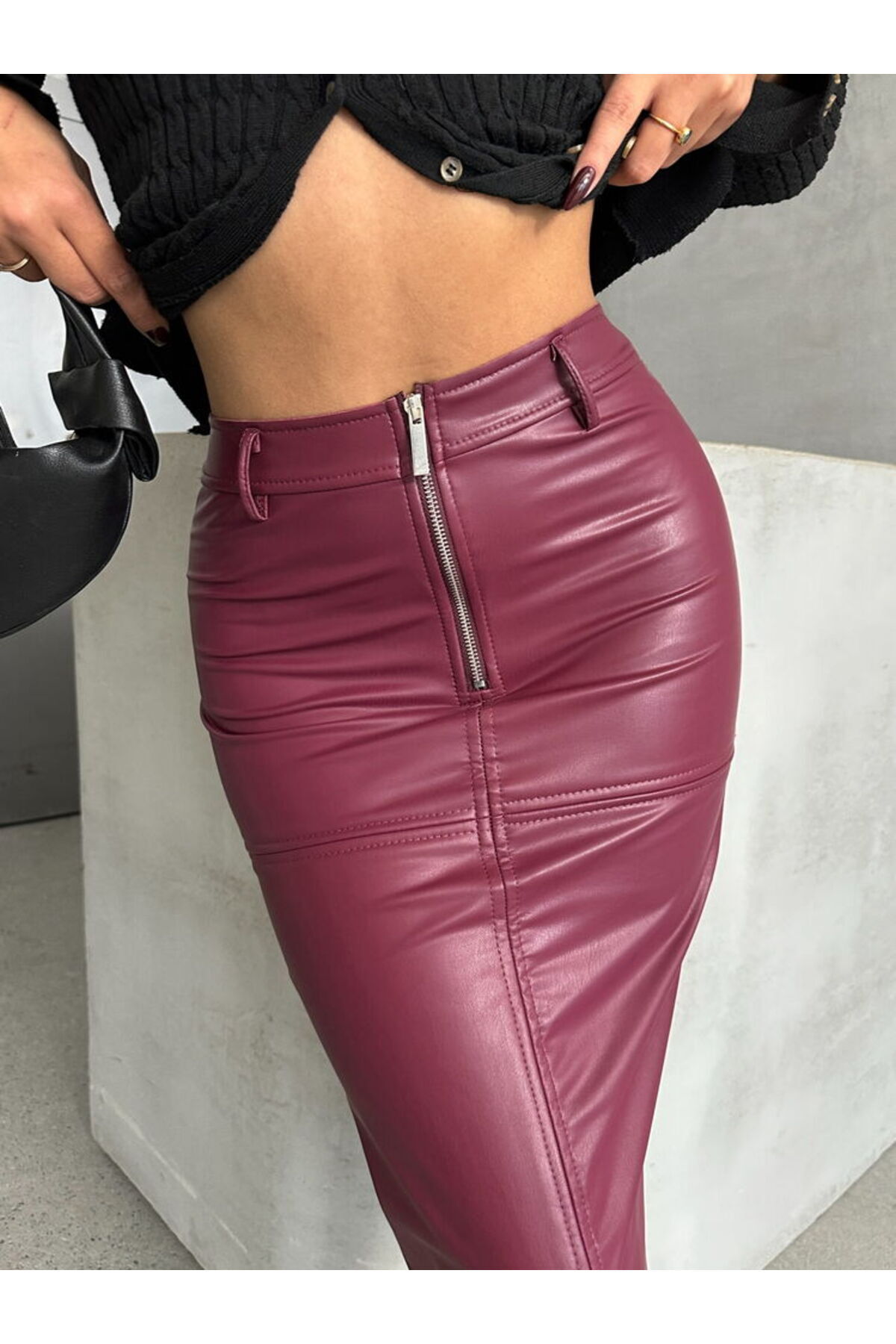 Yüksek Bel Fermuarlı Yırtmaçlı Suni Deri Midi Kalem Etek